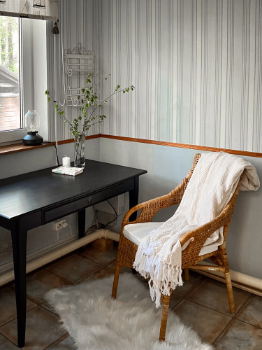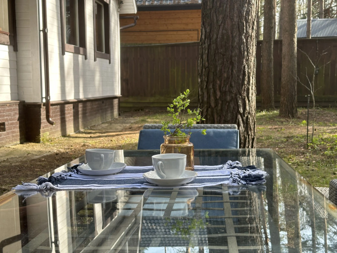 Для бронирования доступен загородный дом 120 кв. м на отдельном участке 12 соток, участок — сосны, ель, кустарники, цветы. На участке оборудованы: мангальная зона, есть шампура и решётка, дрова и уголь гости привозят самостоятельно, уличный камин, небольшая детская площадка, обеденная зона.