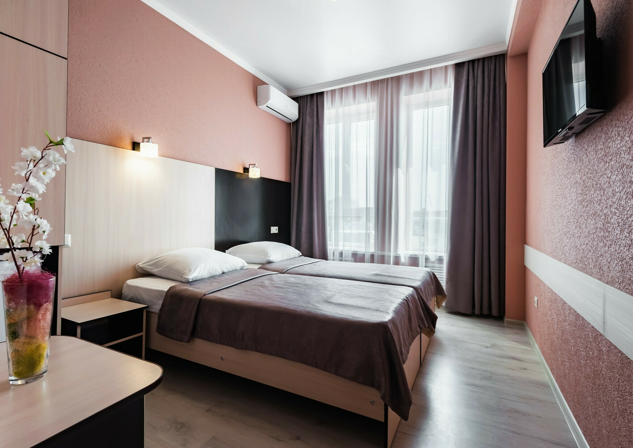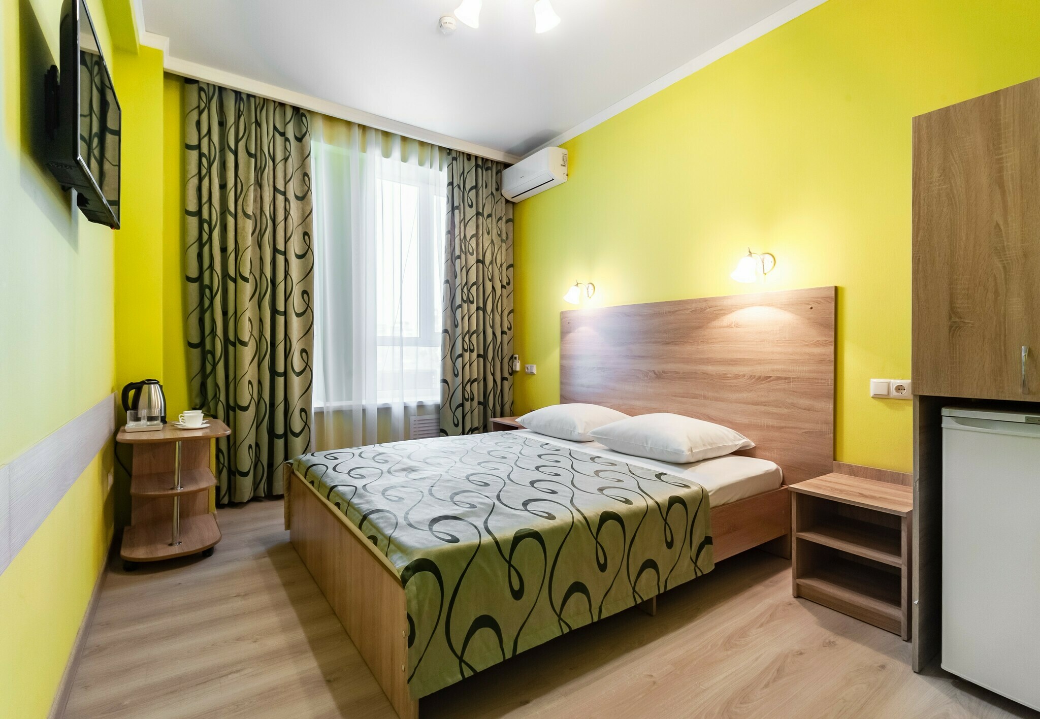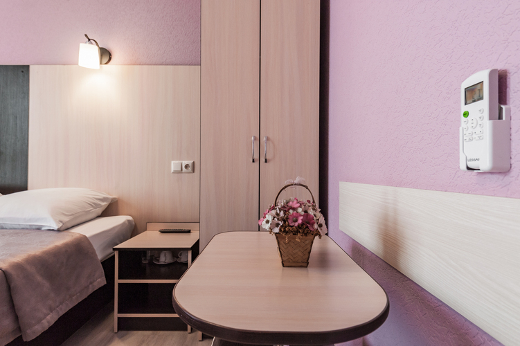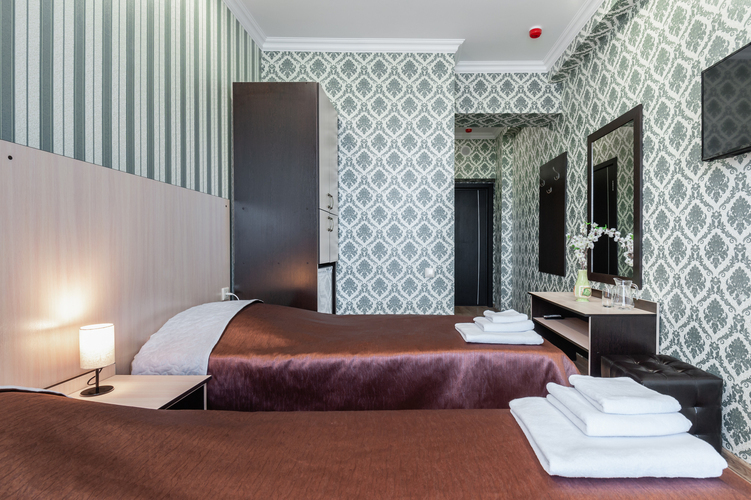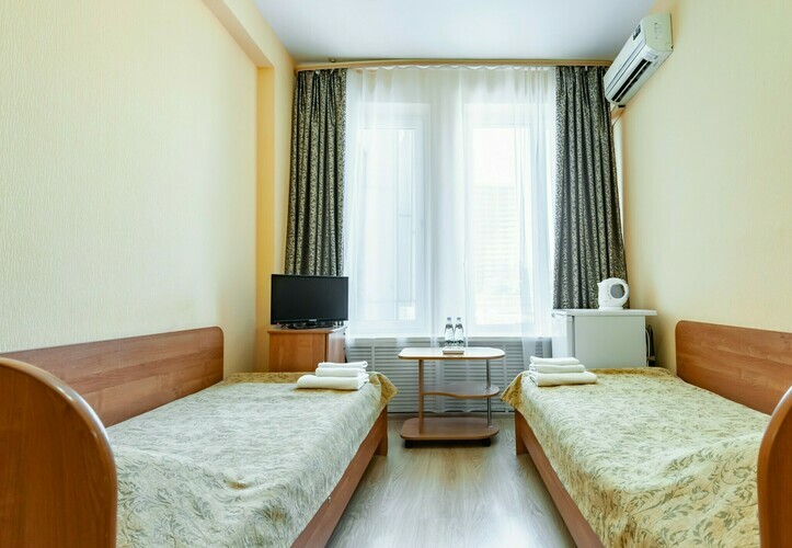 Номер с современным дизайном для туристических и бизнес-поездок. Оснащен всем необходимым для длительного проживания и важными в быту мелочами. Цветовая палитра: свежие фисташковые или персиковые тона. В номере: две раздельные кровати, прикроватные тумбочки, ТВ, Wi-Fi, кондиционер, холодильник, шкаф для одежды, столик, электрический чайник, посуда, туалетные и гигиенические принадлежности, дополнительный комплект: подушка и одеяло. Фен и утюг предоставляется по запросу.