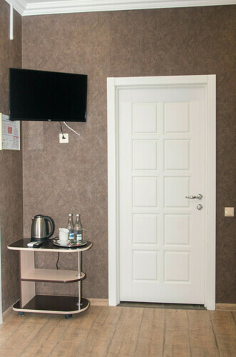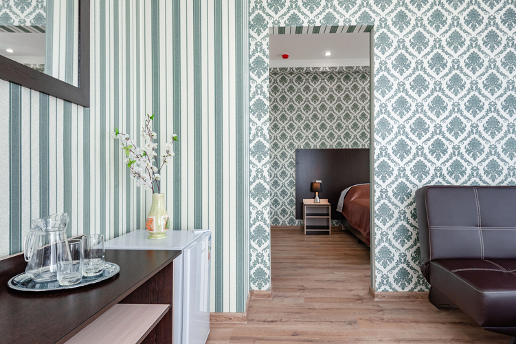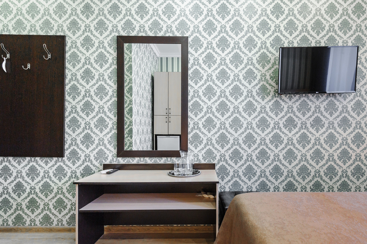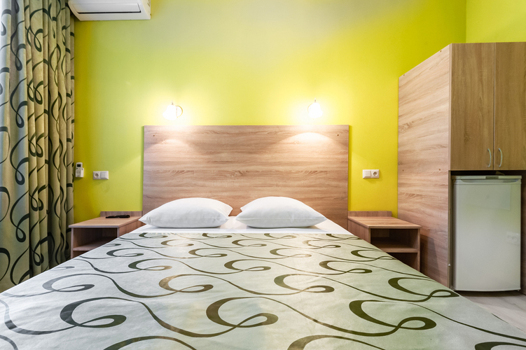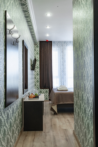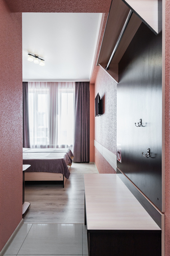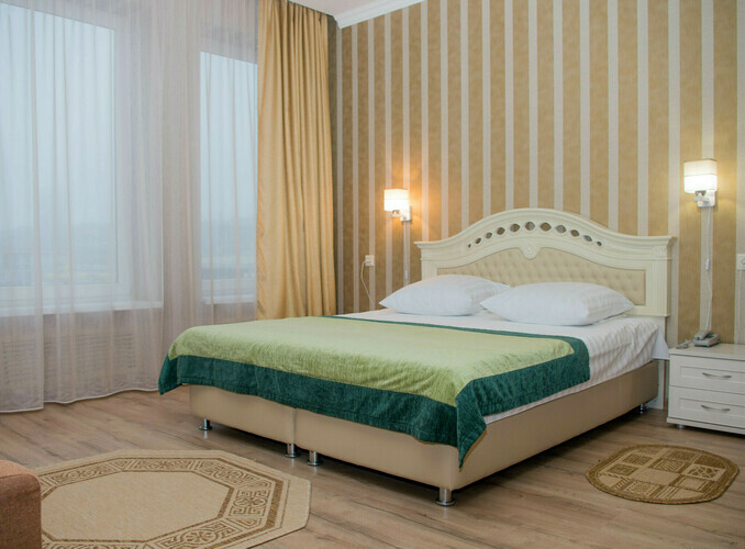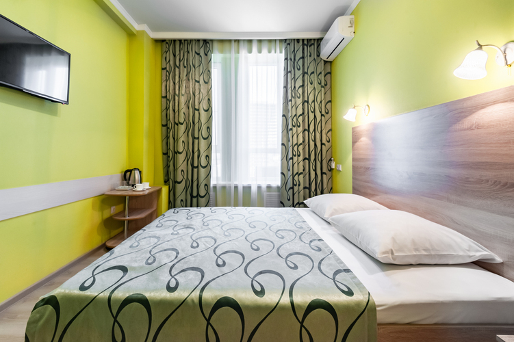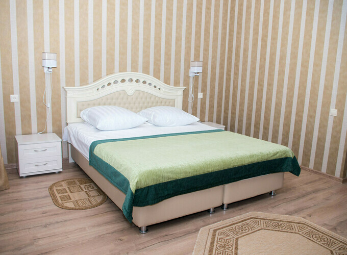 Номер с современным дизайном для туристических и бизнес-поездок. Оснащен всем необходимым для длительного проживания и важными в быту мелочами. Цветовая палитра: свежие фисташковые или персиковые тона. В номере: одна большая кровать, прикроватные тумбочки, ТВ, Wi-Fi, кондиционер, холодильник, шкаф для одежды, столик, электрический чайник, посуда, туалетные и гигиенические принадлежности, дополнительный комплект: подушка и одеяло. Фен и утюг предоставляется по запросу.