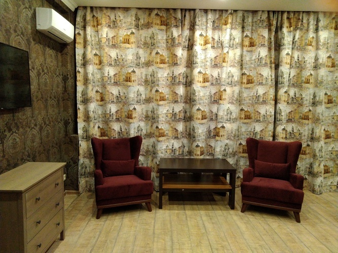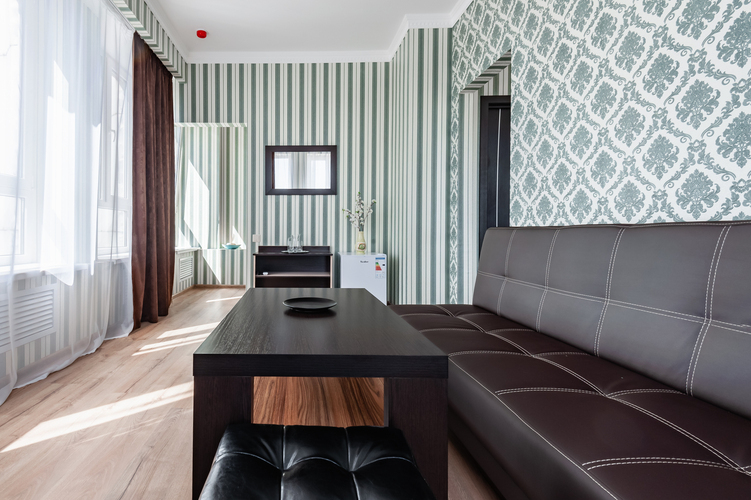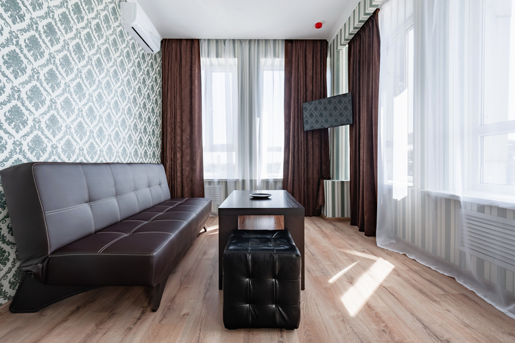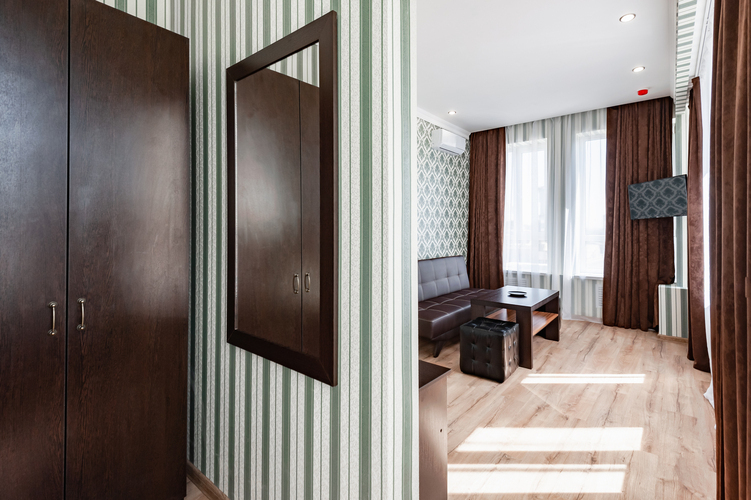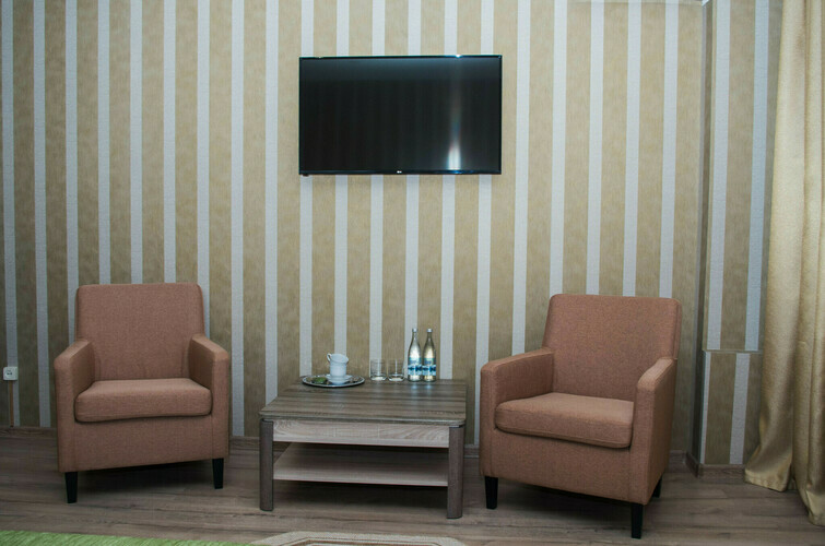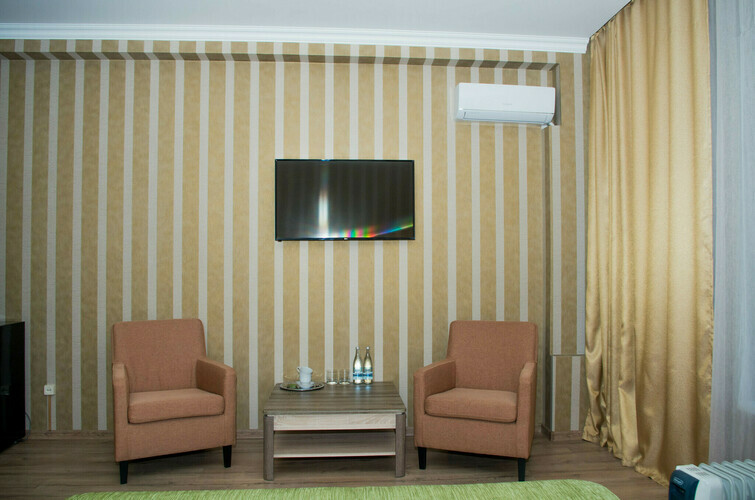 Элегантные номера со свободной планировкой open-spaice и большой ванной комнатой. Интерьер номеров оформлен в спокойных благородных оттенках мятного, бежевого и бардового. Спальная зона оснащена кроватью “King Size” с ортопедическим матрасом, светонепроницаемыми шторами, удобными одеялом и подушками. В номере выделена зона отдыха с двумя креслами и журнальным столиком. Комплектация номера: одна большая кровать, холодильник, система кондиционирования воздуха, Wi-Fi интернет, мебель для хранения в