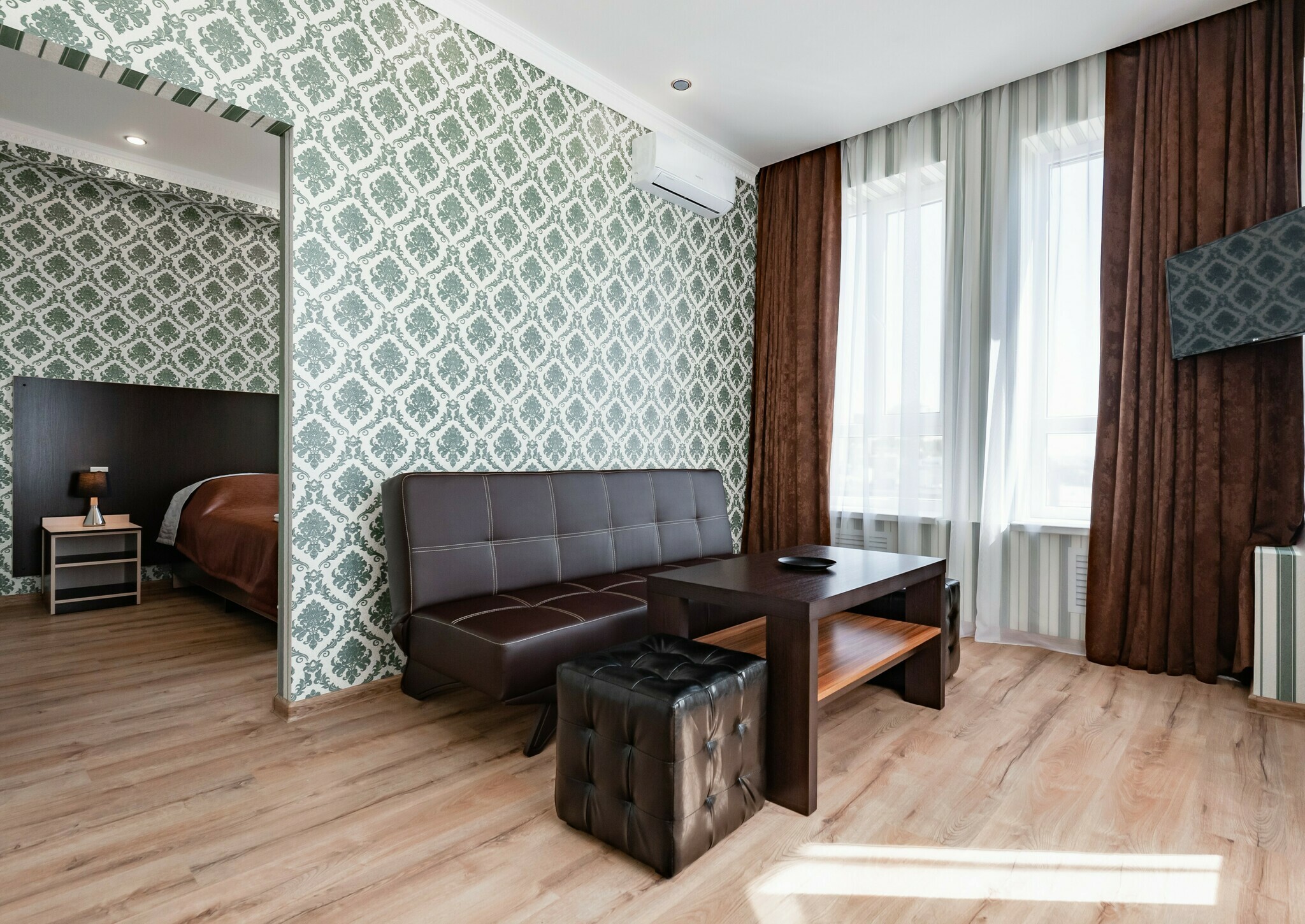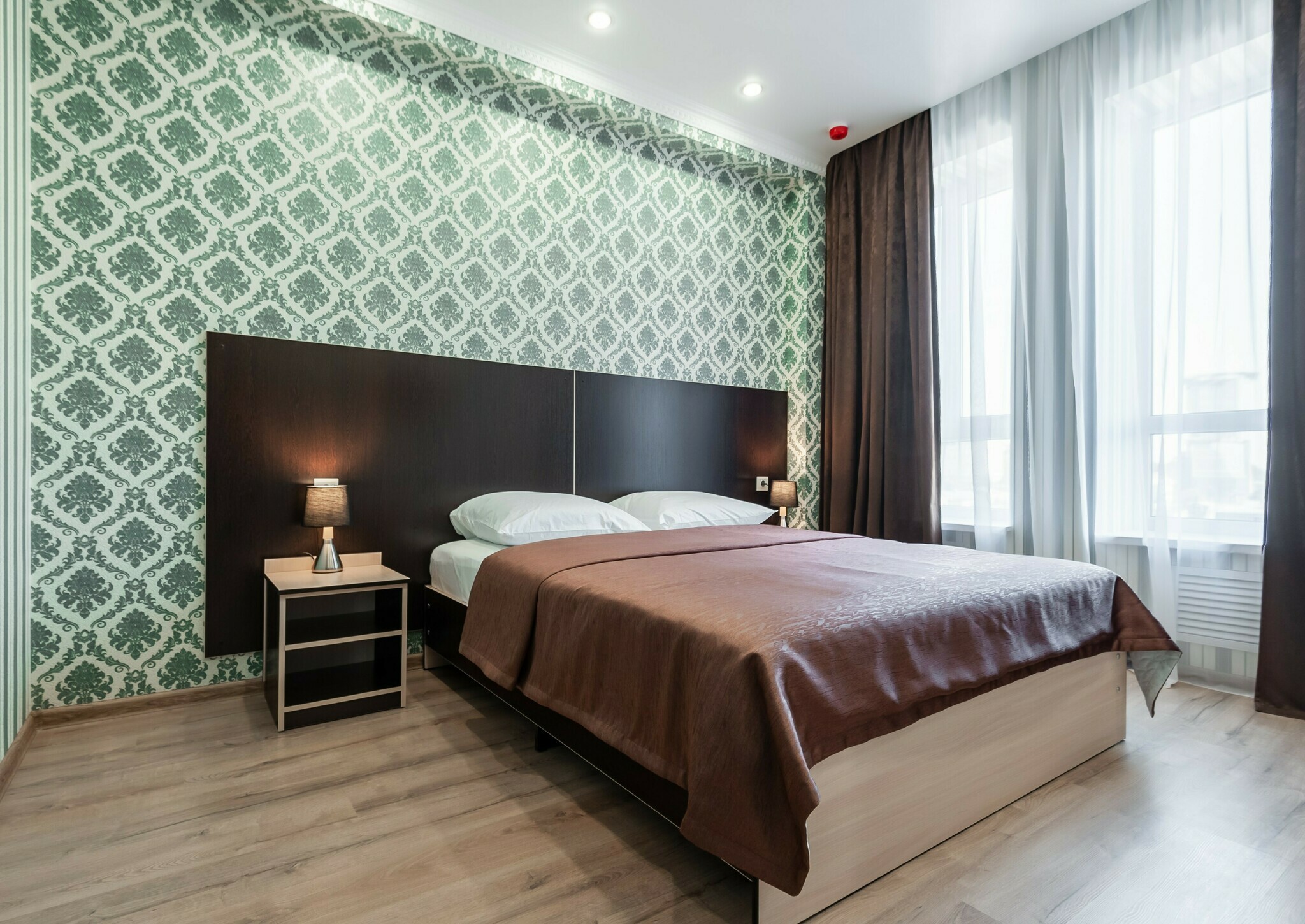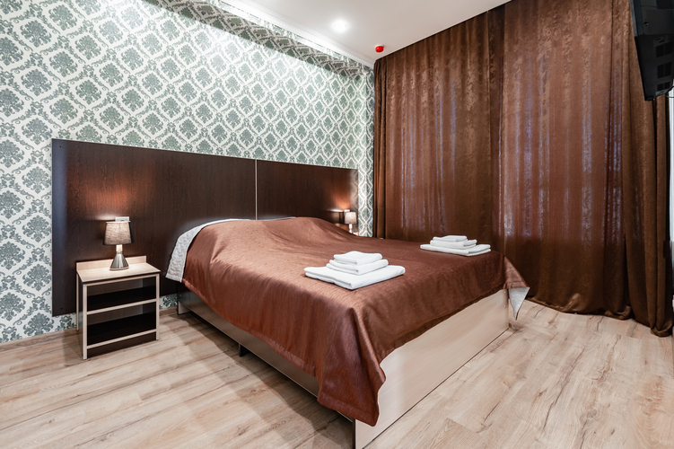 Новые превосходные номера со стильным интерьером. Номера выполнены в изумрудно-коричневых тонах. В номере одна большая кровать. Для хорошего сна предусмотрены светонепроницаемые шторы и матрасы с ортопедическим эффектом.