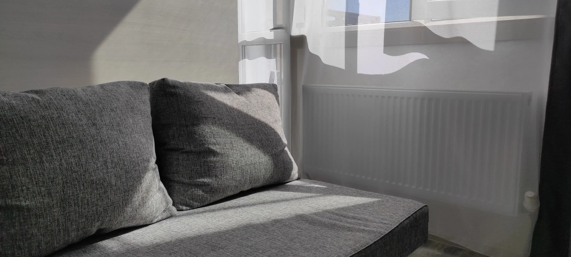 Квартира с ремонтом оснащена необходимым для проживания. Есть двуспальная кровать и диван-кровать, встроенная кухня, обеденная зона, вместительные шкафы, Wi-Fi, кондиционер, телевизор, стиральная машина, микроволновая печь, холодильник, варочная панель, чайник, утюг и фен. Гостям предоставляются комплекты постельного белья, полотенца, посуда, столовые приборы, чай и кофе, средства личной гигиены и моющие средства. В квартире есть небольшой балкон с видом на город и шторы блэк-аут.