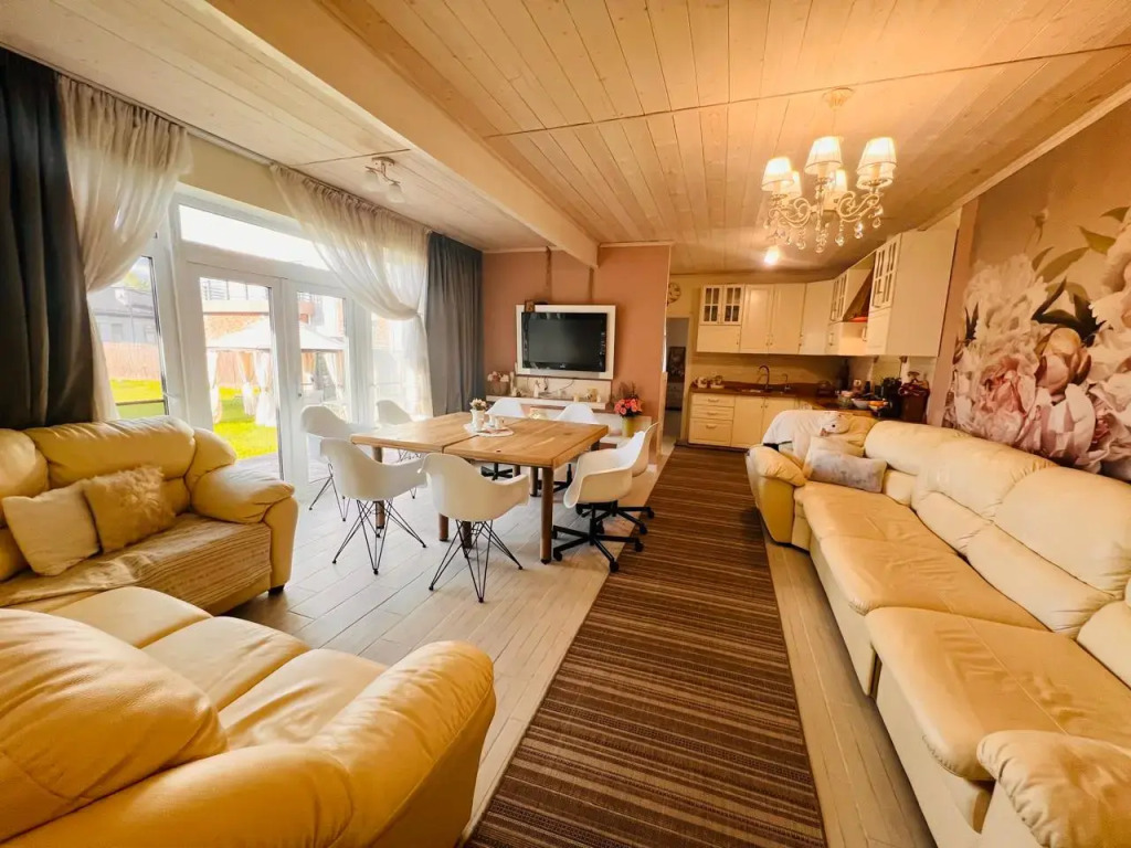 В доме 2 спальни с двумя двуспальными кроватями, кухня-гостиная 37 кв. м с панорамным остеклением, 2 санузла, душевая кабина-ванна. В банной зоне есть дополнительная душевая. Коттедж оснащён необходимой техникой, бытовой химией и средствами личной гигиены.