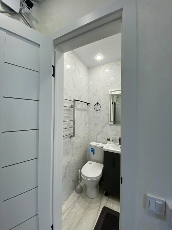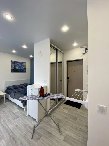 В квартире есть двуспальная кровать с ортопедическим матрасом, подушками и одеялом. Для удобства гостей предоставляются постельное бельё и набор полотенец для каждого гостя. Работает Wi-Fi, есть телевизор с Smart-TV, кондиционер, утюг, гладильная доска, сушилка для белья.