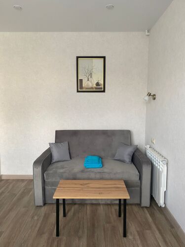 В квартире есть двуспальная кровать с ортопедическим матрасом, подушками и одеялом. Для удобства гостей предоставляются постельное бельё и набор полотенец для каждого гостя. Работает Wi-Fi, есть телевизор с Smart-TV, кондиционер, утюг, гладильная доска, сушилка для белья.