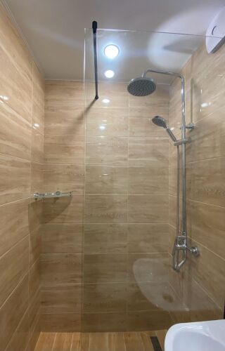 Ванная комната оборудована тропическим душем с сантехникой, полностью покрыта кафельной плиткой. Имеются зеркало с подсветкой, фен, вентилятор для принудительной вытяжки.