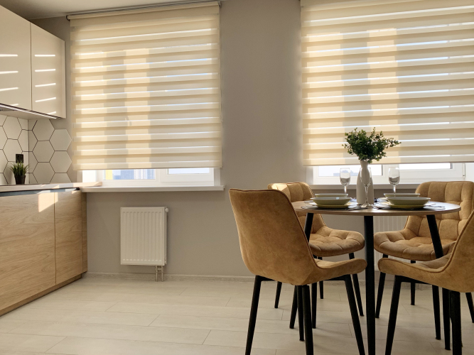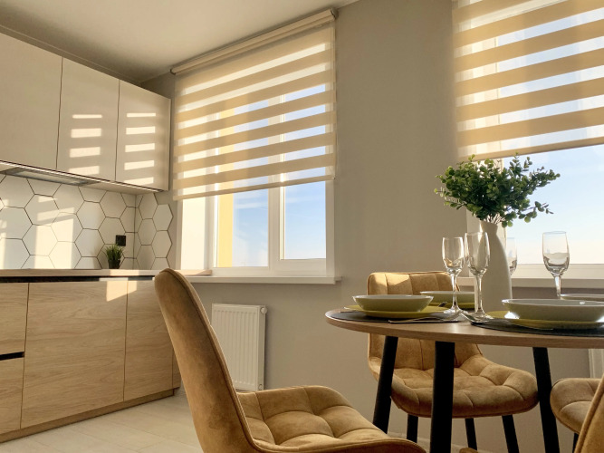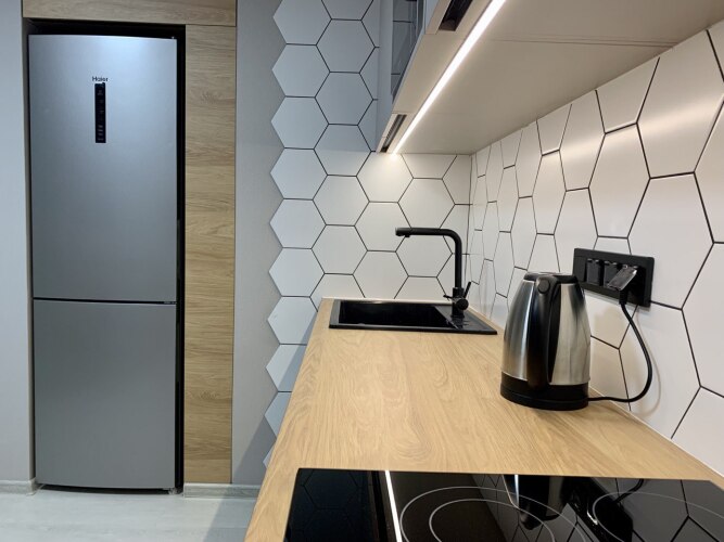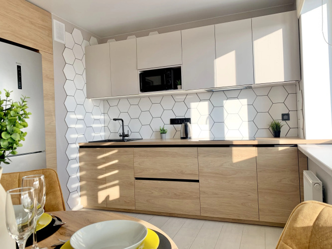 В квартире есть два спальных места — двуспальная кровать с ортопедическим матрасом и раскладывающийся диван. Также имеются: плита, вытяжка, микроволновая печь, холодильник, кондиционер, стиральная машина, водонагреватель, кухонный гарнитур, посуда, необходимая для приготовления и принятия пищи, утюг, гладильная доска, сушилка для белья, фен, 2 Smart телевизора, кабельное TV, бесплатный Wi-Fi, постельное белье и полотенца, туалетные принадлежности, зубные наборы, тапочки.