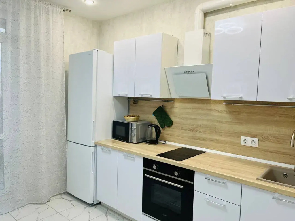 На кухне: электрическая плита, электрический духовой шкаф, чайник, холодильник, кухонные принадлежности для приготовления и употребления пищи, чай, кофе, сахар.