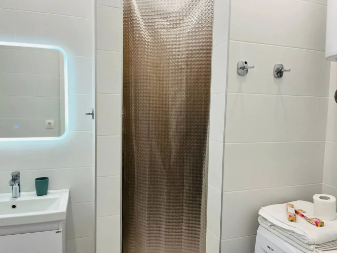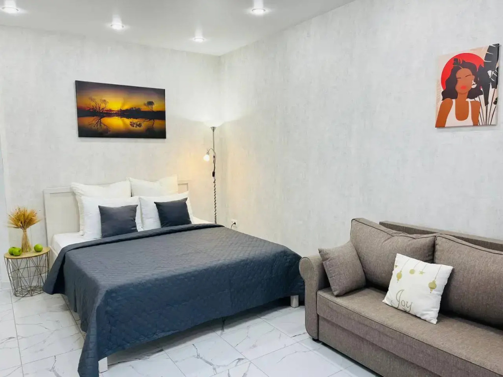 В распоряжении гостей: двуспальная кровать, двухместный диван, шкаф, LED-телевизор, сеть Wi-Fi, постельное бельё и полотенца, утюг, гладильная доска, сушка для белья, кондиционер, стиральная машина, фен.