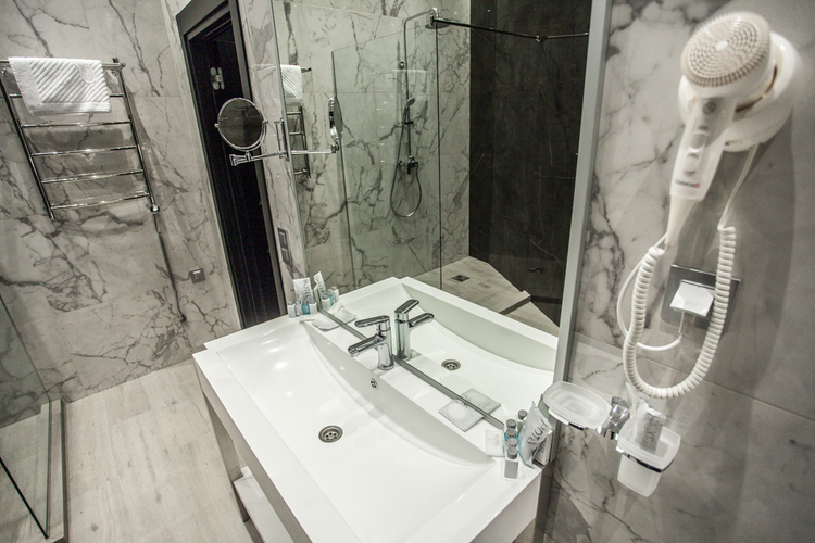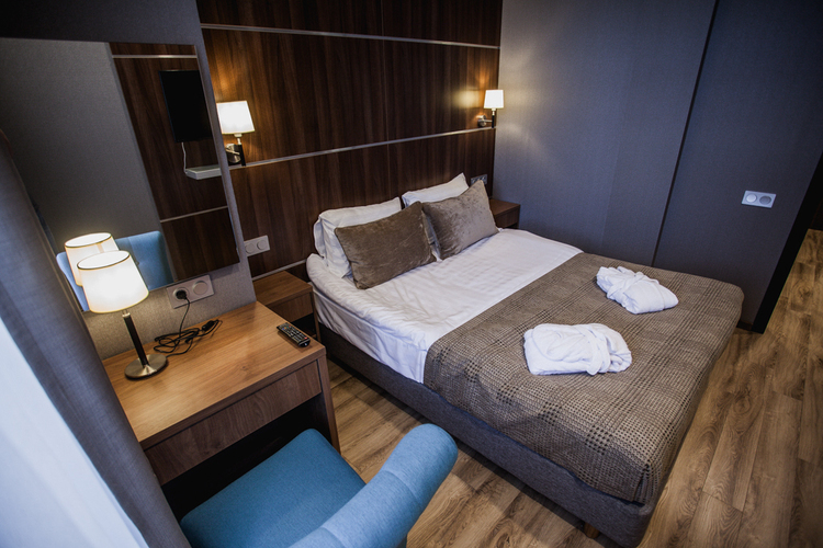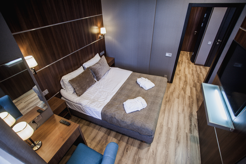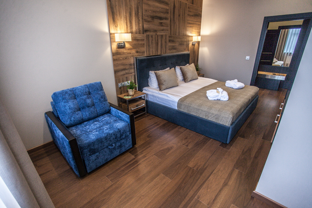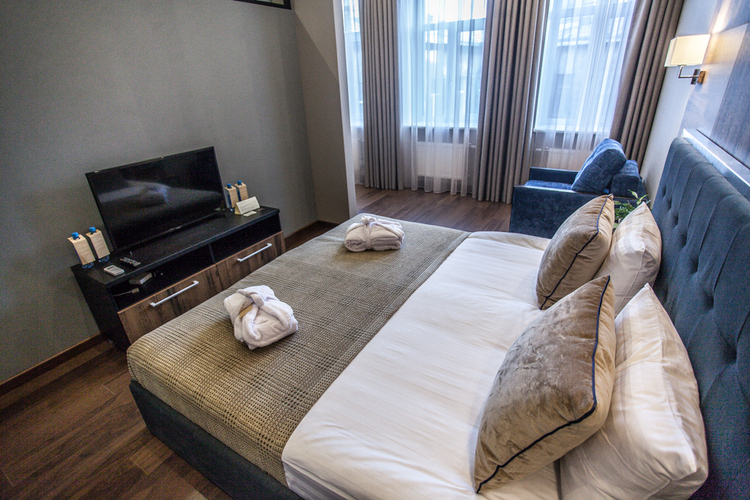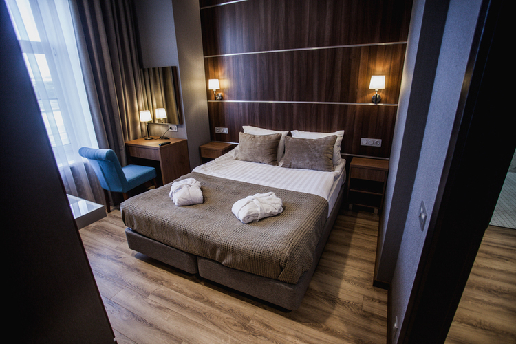 Эксклюзивный дизайн и светлые тона номера создают неповторимое сочетание комфорта и уюта. В каждом номере имеется большая двуспальная кровать, современная техника, ванная комната и душевая кабина. Двуспальная кровать Площадь номера — 23 м² Ванная комната Душевая кабина Предметы личной гигиены в ванной комнате Роскошные халаты и домашние тапочки 40" LCD-телевизор Станционарный телефон Кондиционер Мини-бар Кофейный набор Сейф Рабочий стол Прикроватные тумбочки