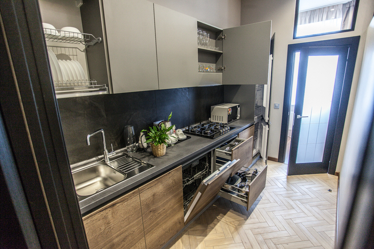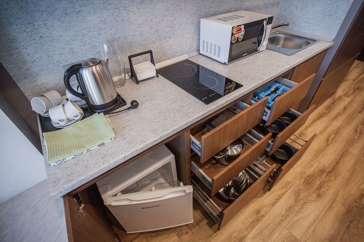 Апартаменты с одной спальней — просторный номер с повышенным уровнем комфорта. В комнате располагается большая двуспальная кровать, а на кухне двуспальный диван-кровать. Кухня оснащена всеми нужными для проживания вещами. Ванная комната оборудована всеми необходимыми принадлежностями. • Двуспальная кровать • Диван-кровать • Площадь номера — 55 м² • Кухня • Кухонные принадлежности • Плита • Микроволновая печь • Холодильник • Электрический чайник • Обеденный стол • Ванная комната • Душевая каби