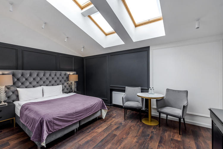 Номера категории "Стандарт", расположенные на 5 этаже отеля имеют мансардное остекление, что позволит гостям любоваться белыми ночами летом и пушистым снегом зимними вечерами. В номере находится чайная станция, телевизор со смарт-управлением. Зона отдыха оборудована журнальным столом и стульями. В ванной комнате находится душевая кабина, туалет, фен и банные принадлежности. При размещении 3х гостей предоставляется евро-раскладушка.