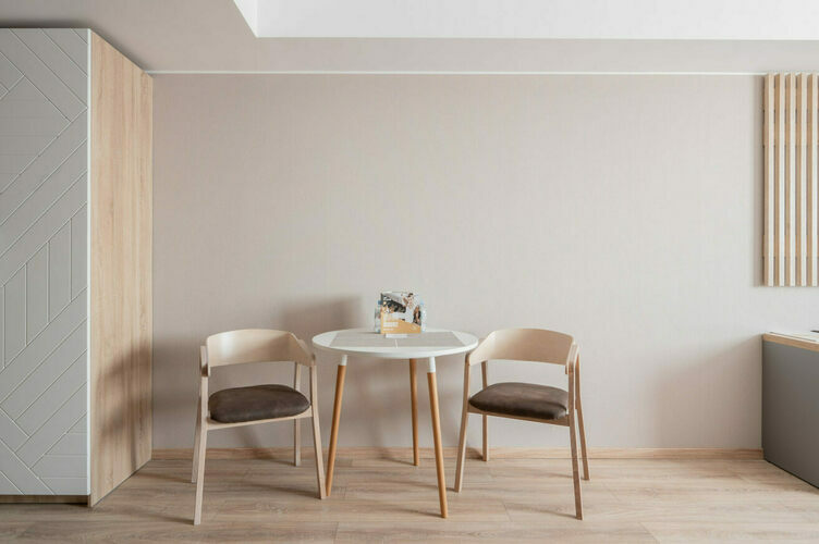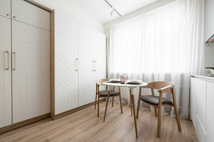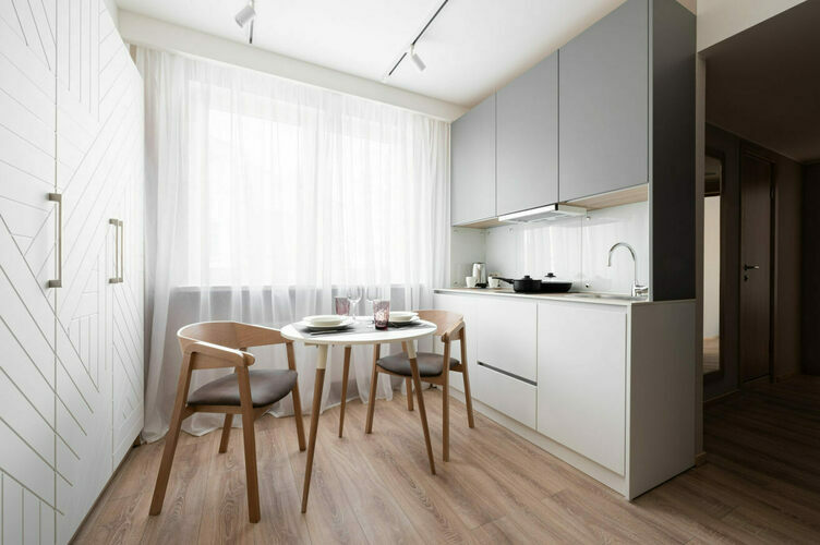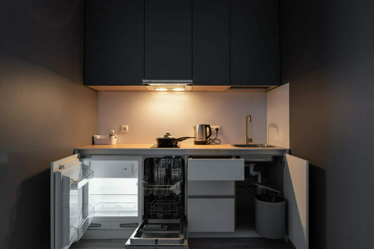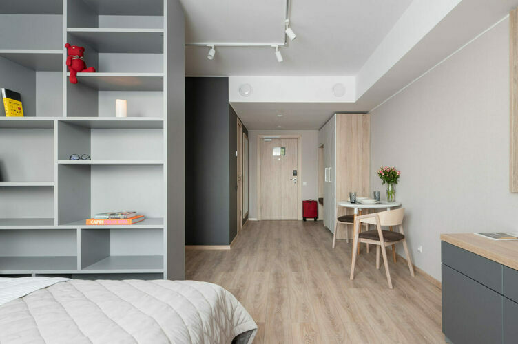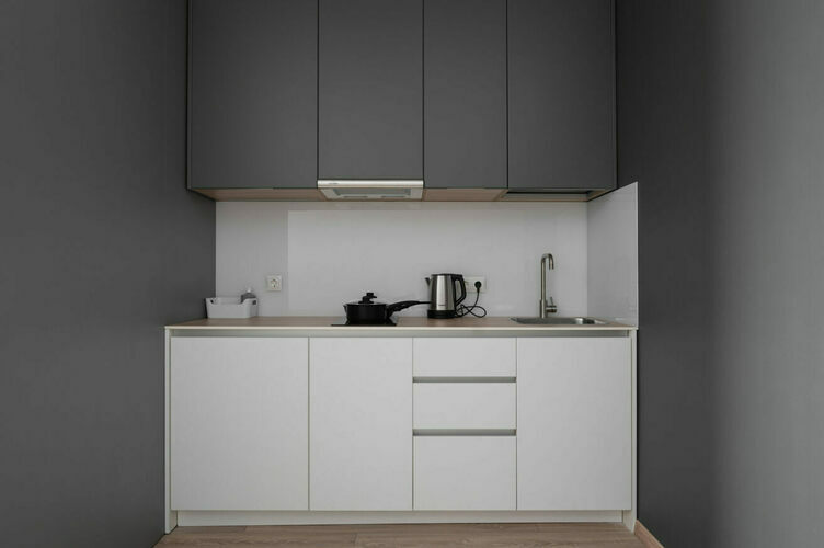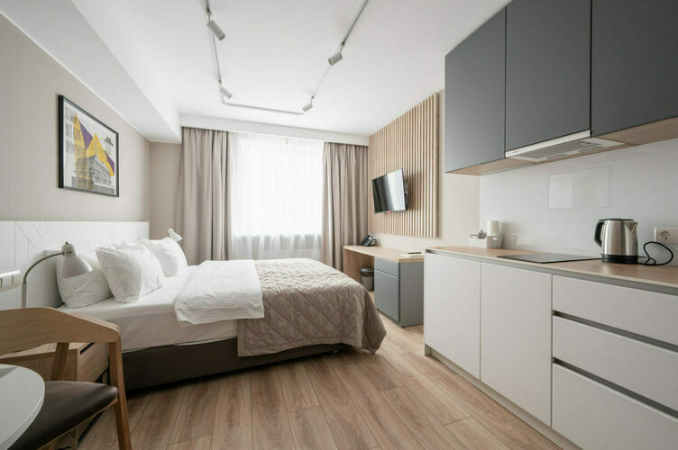 Апартаменты полностью мебелированы и комфортны как для краткосрочного, так и долгосрочного проживания. В апартаменте полностью оборудованная кухня с современной бытовой техникой (холодильник с морозильной камерой, варочная панель, вытяжка, микроволновая печь). Гостям предоставляется полный комплект посуды, столовые приборы, кухонные принадлежности. Также в студии есть большая кровать (king size/twin) c ортопедическим матрасом и гипоаллергенными подушками; оборудована зона для работы или учебы.
