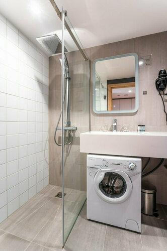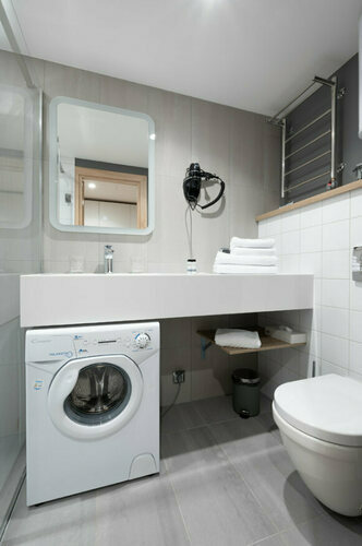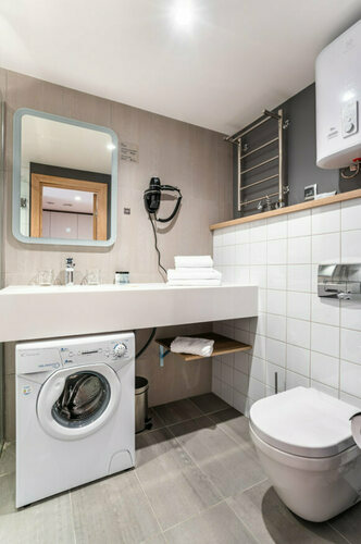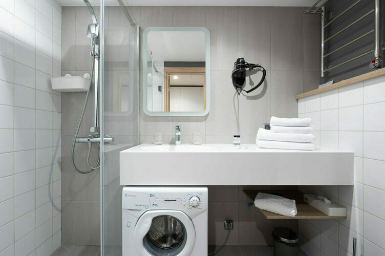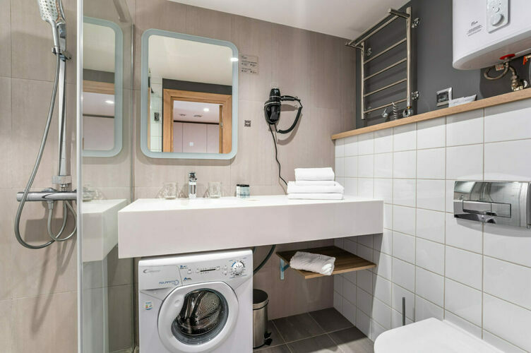 Апартаменты полностью мебелированы и комфортны как для краткосрочного, так и долгосрочного проживания. В апартаменте установлена полностью оборудованная кухня с современной бытовой техникой (холодильник с морозильной камерой, варочная панель, вытяжка, микроволновая печь, посудомоечная машина). Гостям предоставляется полный комплект посуды, столовые приборы, кухонные принадлежности. Также в апартаментах есть большая кровать (king size/twin) c ортопедическим матрасом и гипоаллергенными подушками.