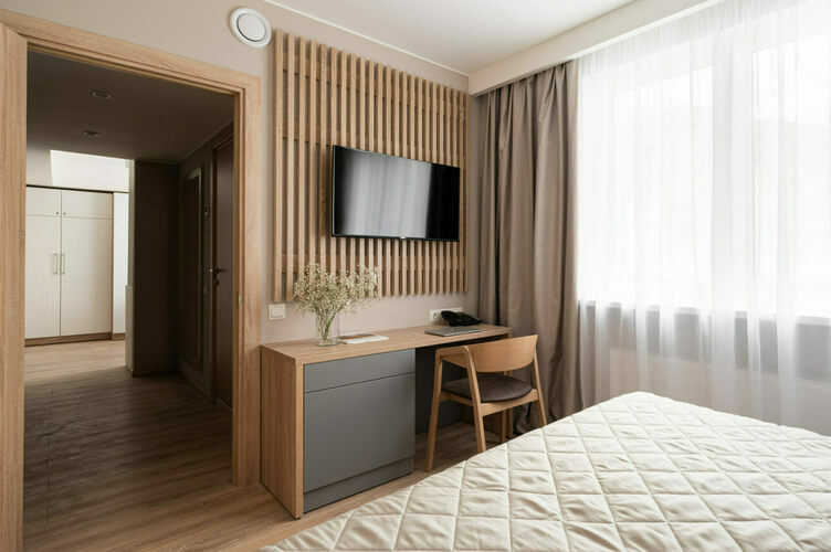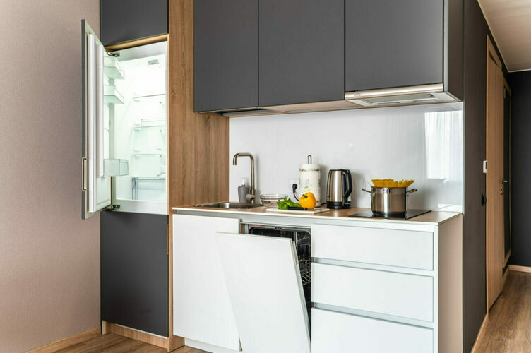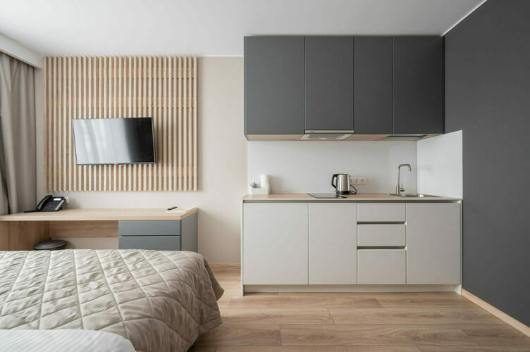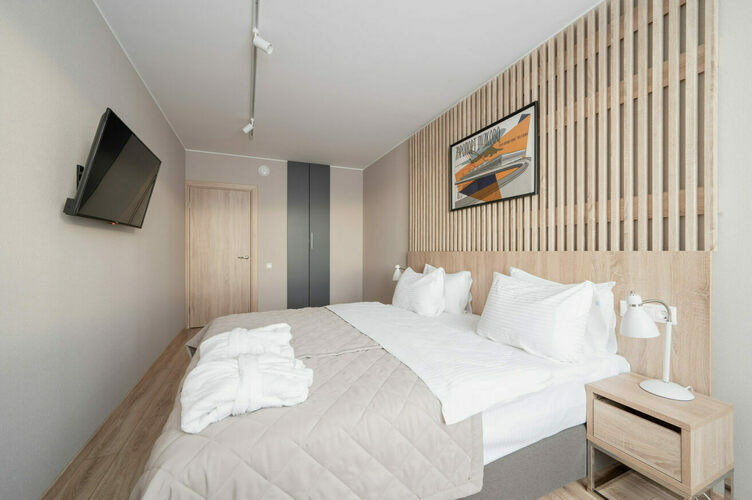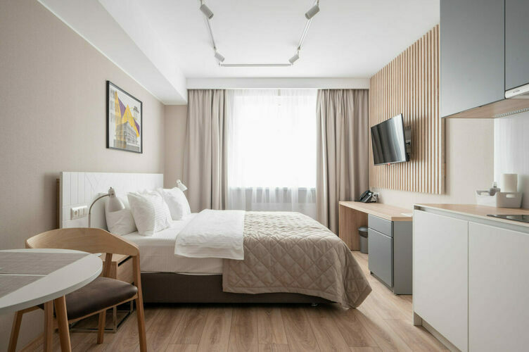 Апартаменты с отдельной спальней и кухней-гостиной полностью мебелированы и комфортны как для краткосрочного, так и долгосрочного проживания. В апартаменте установлена полностью оборудованная кухня с современной бытовой техникой (холодильник с морозильной камерой, варочная панель, вытяжка, микроволновая печь, посудомоечная машина). Гостям предоставляется полный комплект посуды, столовые приборы, кухонные принадлежности. В спальне есть большая кровать (king size/twin) c ортопедическим матрасом.