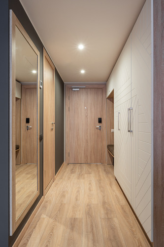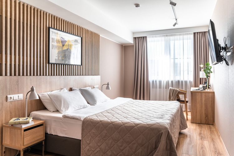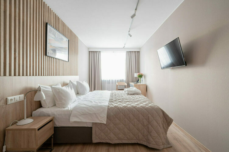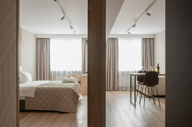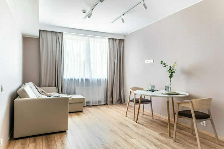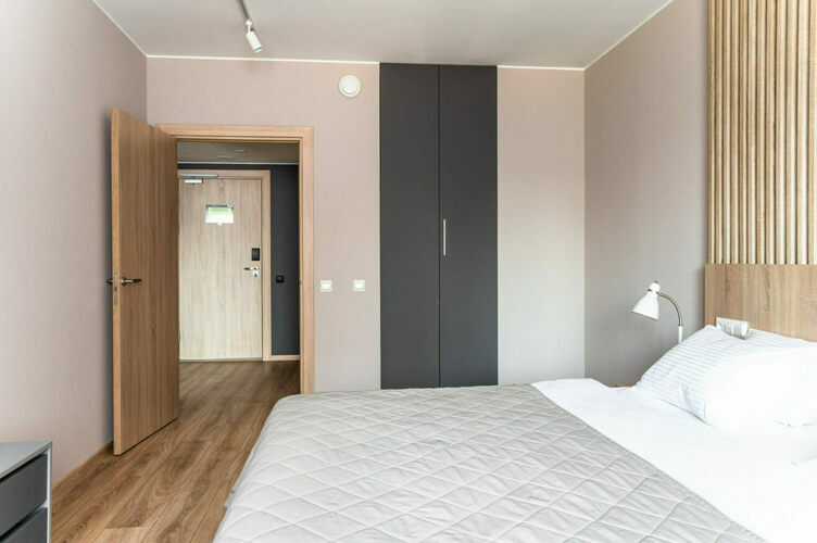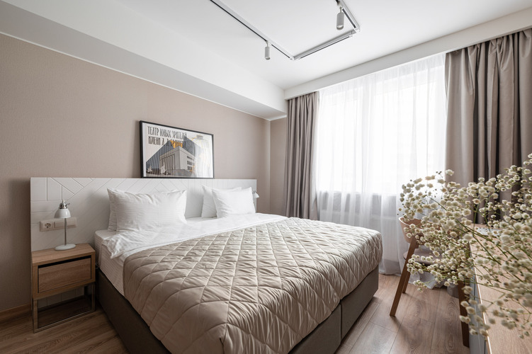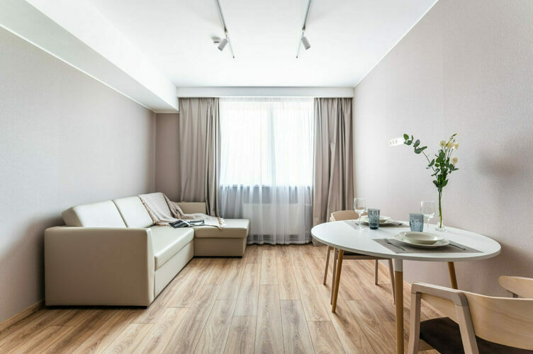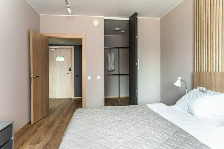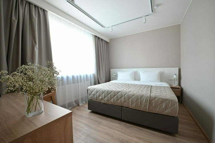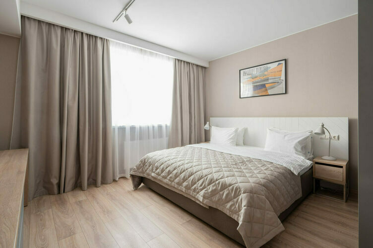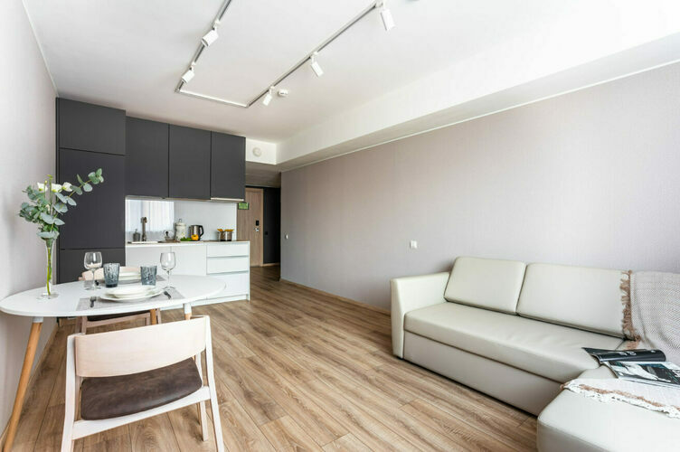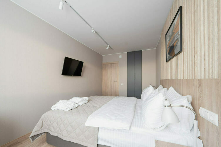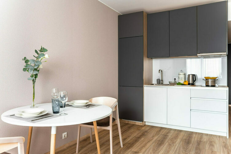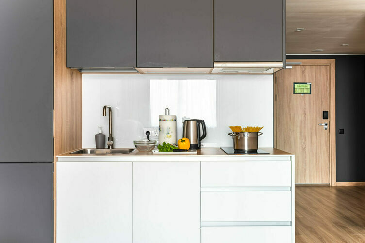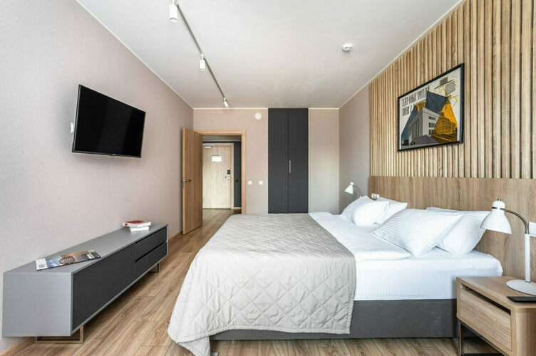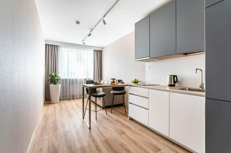 Апартаменты с отдельной спальней полностью мебелированы и комфортны как для краткосрочного, так и долгосрочного проживания. В апартаменте установлена полностью оборудованная кухня с современной бытовой техникой (холодильник с морозильной камерой, варочная панель, вытяжка, микроволновая печь). Гостям предоставляется полный комплект посуды, столовые приборы, кухонные принадлежности. Также в апартаментах есть большая кровать (king size/twin) c ортопедическим матрасом и гипоаллергенными подушками.