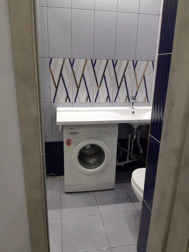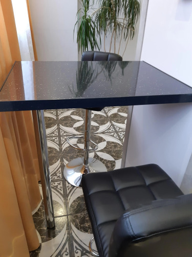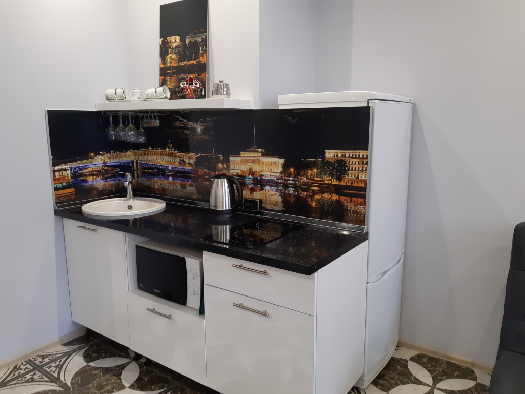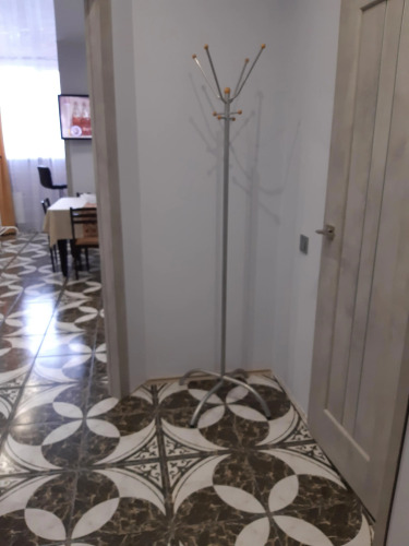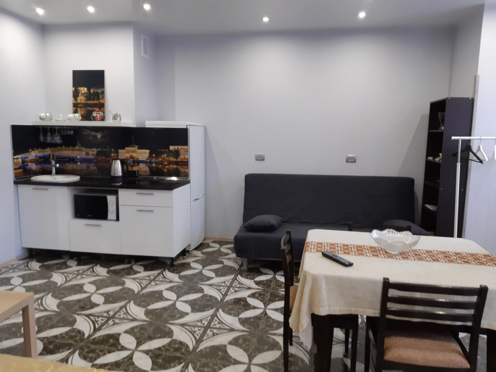 В апартаментах могут разместиться до 4 человек на двуспальном диване и кровати. Санузел раздельный — туалет с умывальником и отдельная душевая комната. На кухне встроенная электропанель, чайник, микроволновая печь, набор посуды — тарелки, вилки, ложки, кружки, стаканы, бокалы, сковорода, кастрюля. Духового шкафа нет. Также доступны гладильная доска с утюгом, фен, тапочки, постельные и банные принадлежности, стиральная машина, холодильник, пылесос, телевизор и бесплатный интернет Wi-Fi.