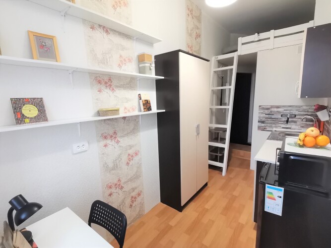 На первом уровне студии есть диван-кровать (не во всех, в зависимости от студии), шкаф, стол со стулом и табуретом. На втором уровне студии размещено спальное место с матрасом 140х200 см. Декоративное оформление студий может отличаться от того, что на фото.