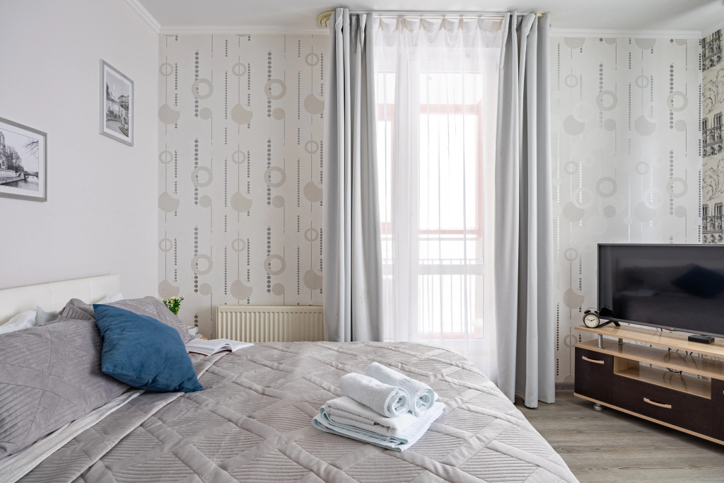 Из апартаментов открывается вид на город. Для комфорта гостей в апартаментах есть кровать с ортопедическим матрасом, раскладной диван, горячая вода круглый год, стиральная машинка, утюг с гладильной доской, сушилка для белья, фен, отдельный санузел с ванной, кухня оборудованная необходимым для приготовления пищи и сервировки, полноценное рабочее место и балкон с видом на город.