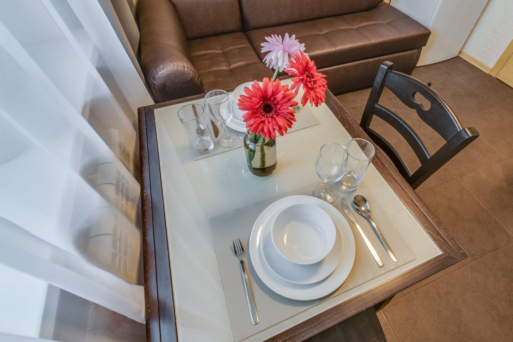 В апартаментах большая двуспальная кровать с ортопедическим матрасом и раскладывающимся диваном в кухне-гостиной. В апартаментах имеется микроволновая печь, фен, электрический чайник, холодильник, электрическая плита с духовым шкафом, утюг с гладильной доской.
