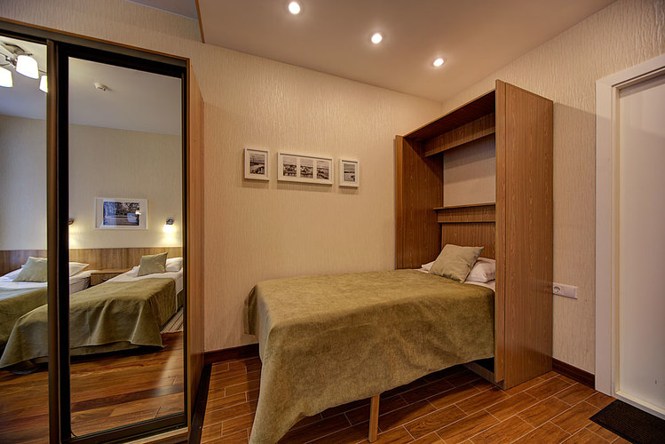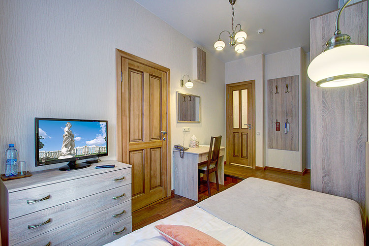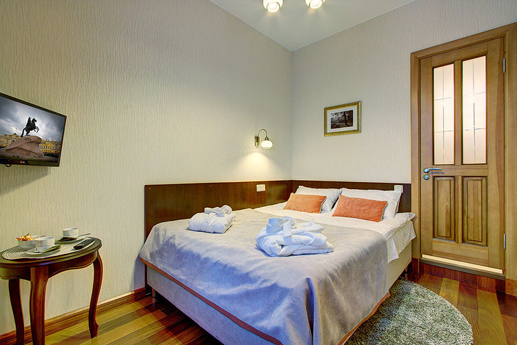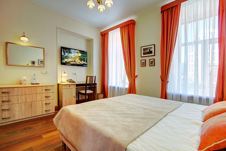Номер с одной двуспальной кроватью и ванной комнатой с ванной. В номере телевизор, телефон, сейф, кондиционер, фен. Бесплатный Wi-Fi. Вид из окон на ул. Маяковского или тихий внутренний дворик. Возможно размещение с маленькими детьми - есть люлька.