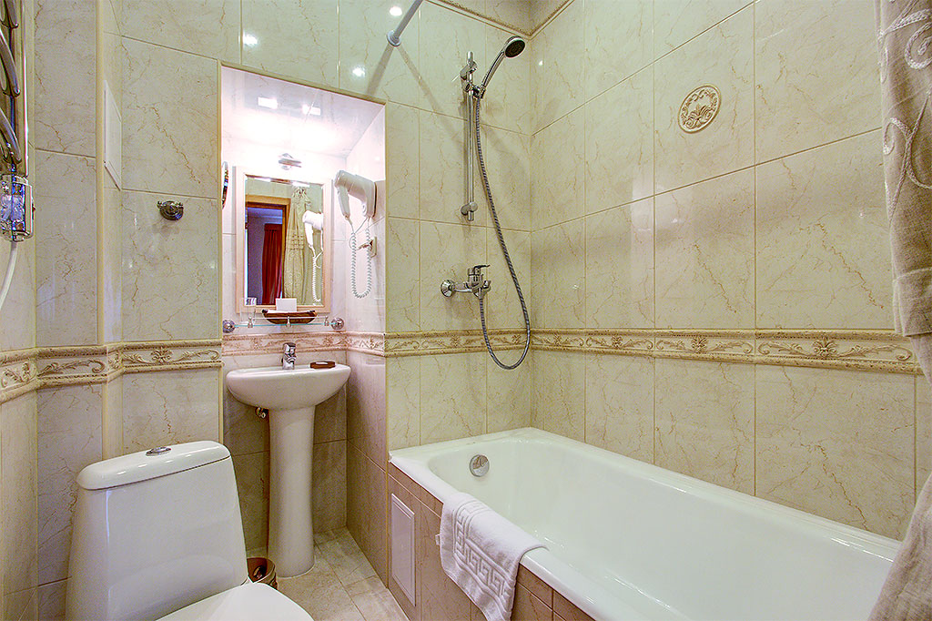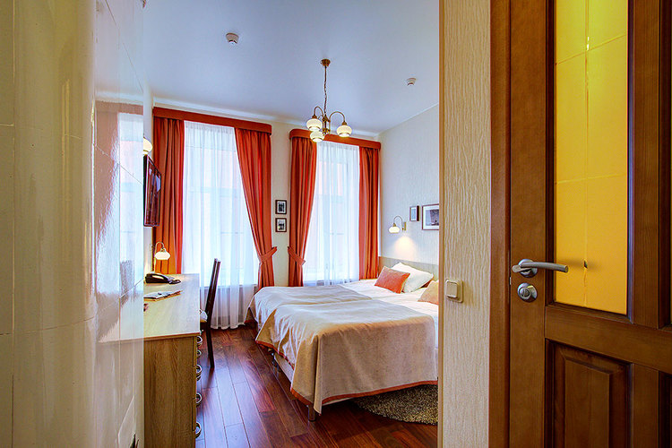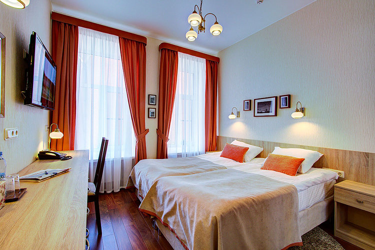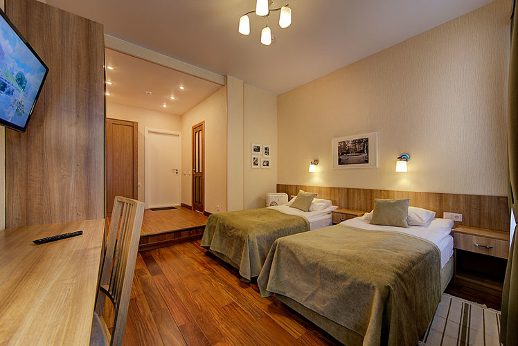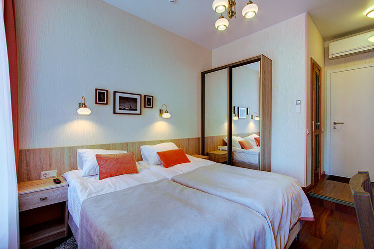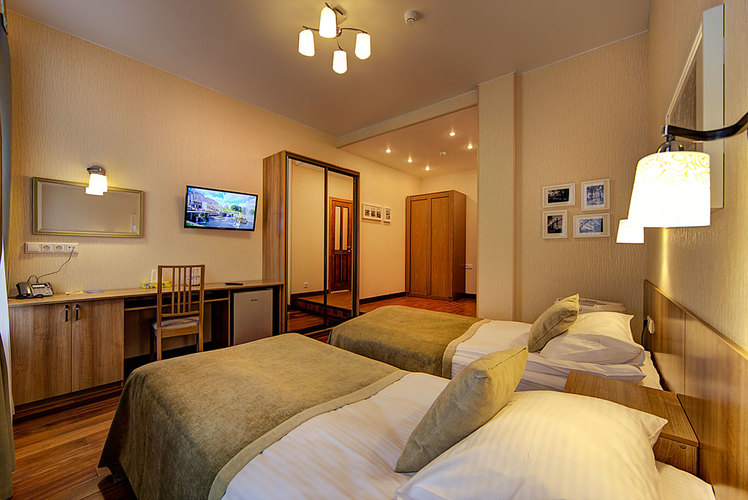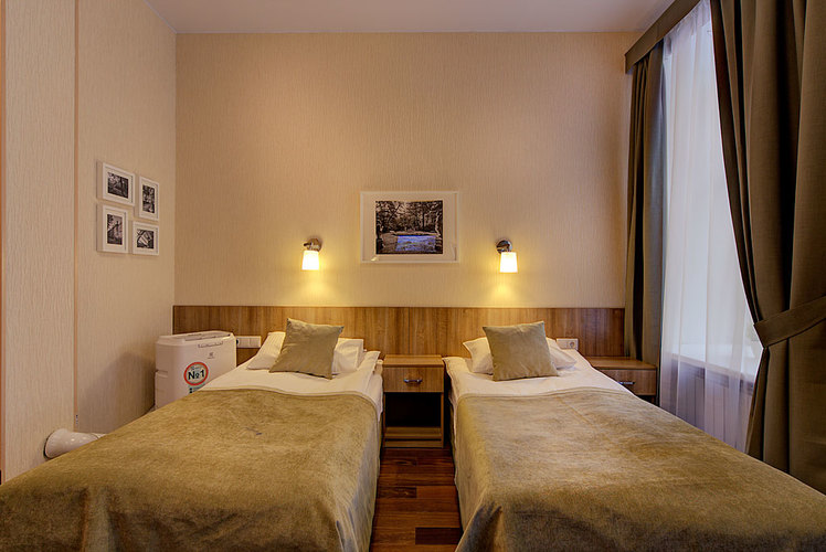 Номер с двумя односпальными раздельными кроватями и ванной комнатой с ванной. В номере телефон, телевизор, кондиционер, сейф, фен. Бесплатный Wi-Fi. Вид из окон номера на ул. Маяковского или тихий внутренний дворик. Кровати возможно плотно сдвинуть и застелить как одну большую двуспальную кровать (по запросу). Возможно размещение маленьких детей - есть люлька.