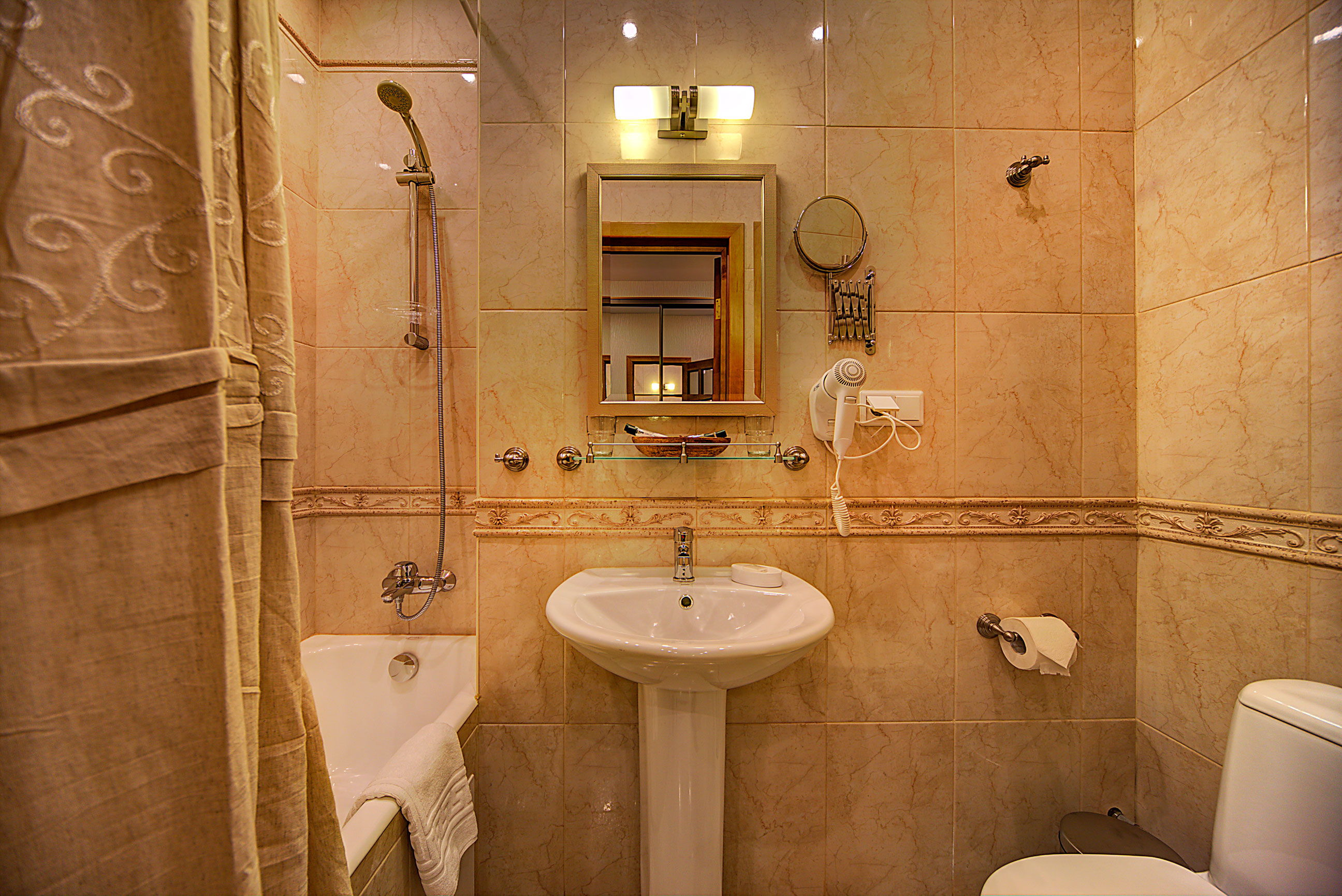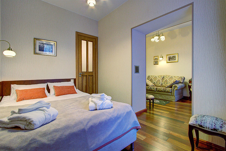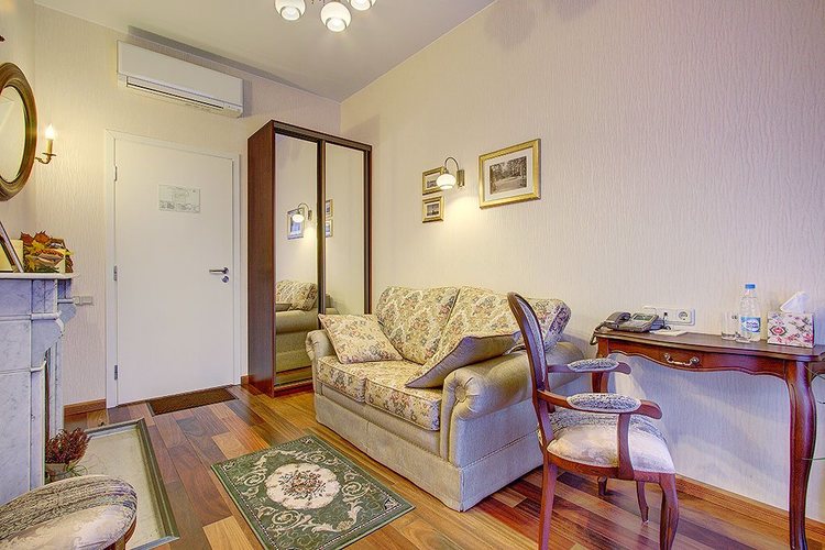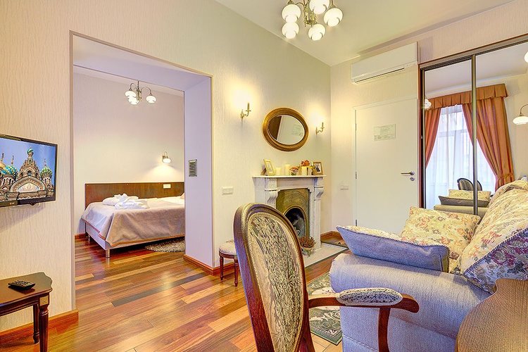 Номер с двумя смежными комнатами: спальней и гостиной. В спальне - одна двуспальная кровать, столик, телевизор; в гостиной - старинный камин, диван, мини холодильник, кофе-машина, телевизор, сейф. Диван раскладывается и на нем может дополнительно разместиться один человек. Вид из окна и балкона номера на ул. Маяковского. Ванная комната с ванной, есть фен и халаты. Бесплатный Wi-Fi. Возможно размещение с маленькими детьми - есть люлька.