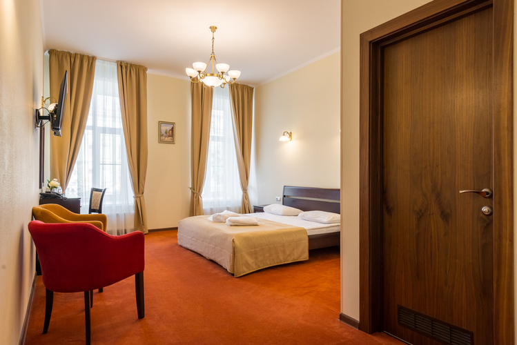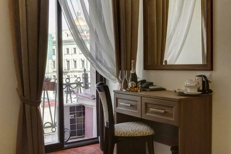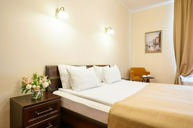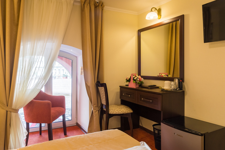 Комфортабельный номер, вид открывается на набережную реки Мойки. Отличительной изюминкой, данной категории, является просторная гидромассажная ванная и кресло, которое разбирается и становится полноценным спальным местом.