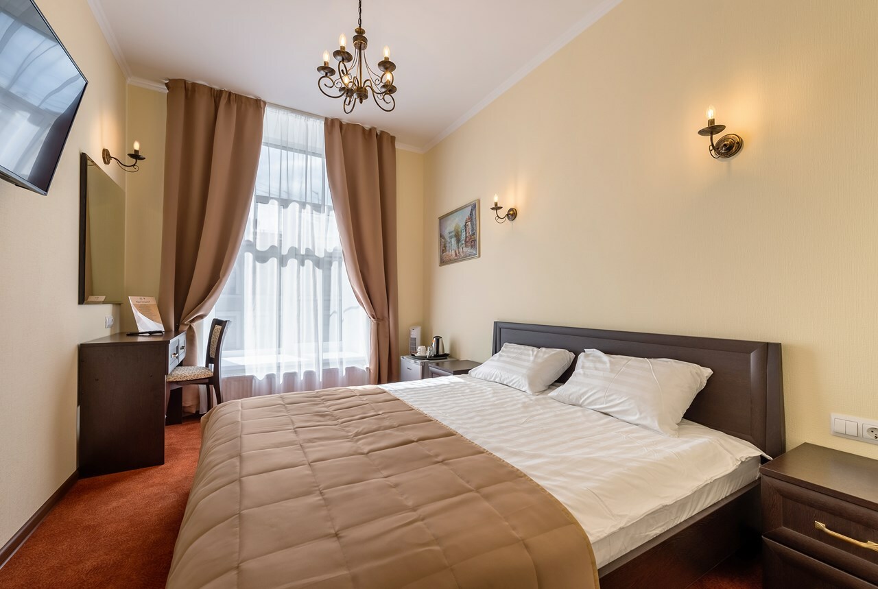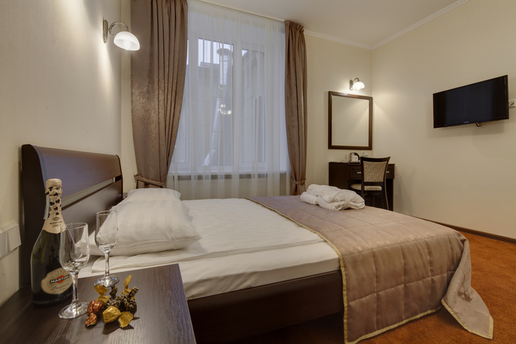 Светлый просторный номер 17м. Одна большая кровать. Телевизор, кондиционер. Удобства в номере (душевая кабина). Телефон, выход в Интернет. Вид на город (Адмиралтейство, Зимний дворец)