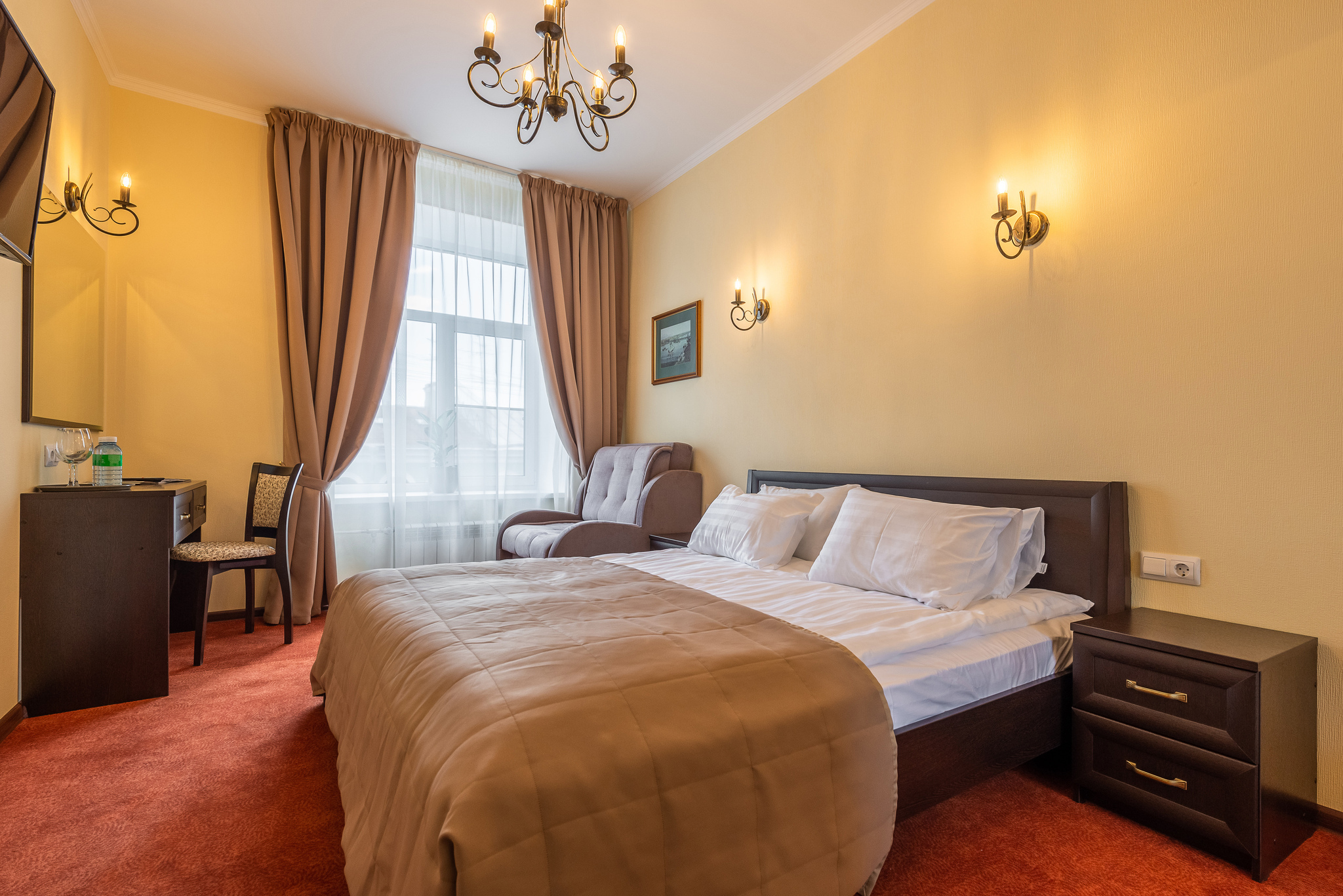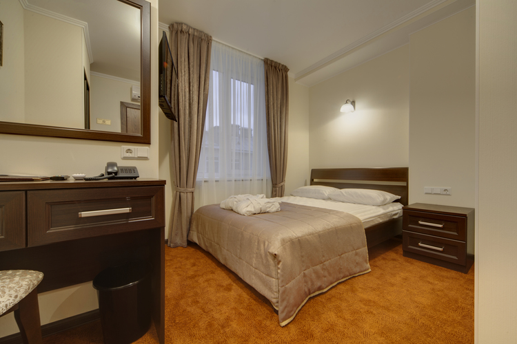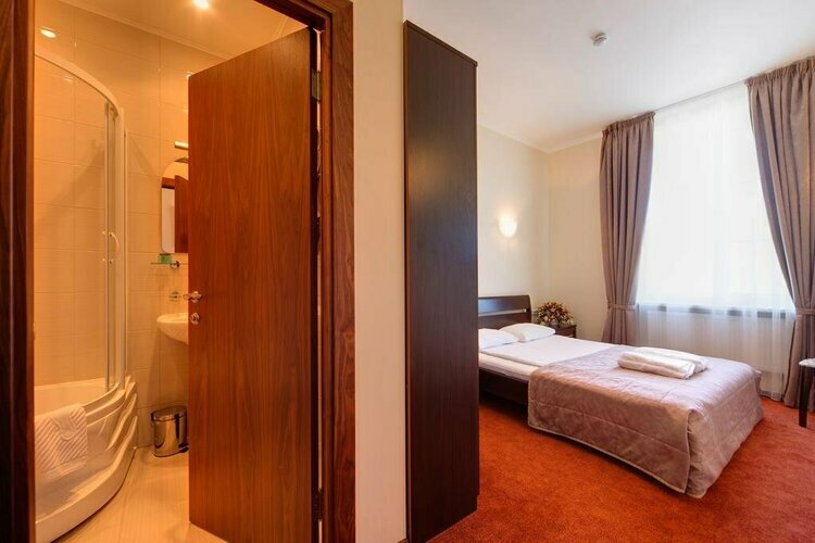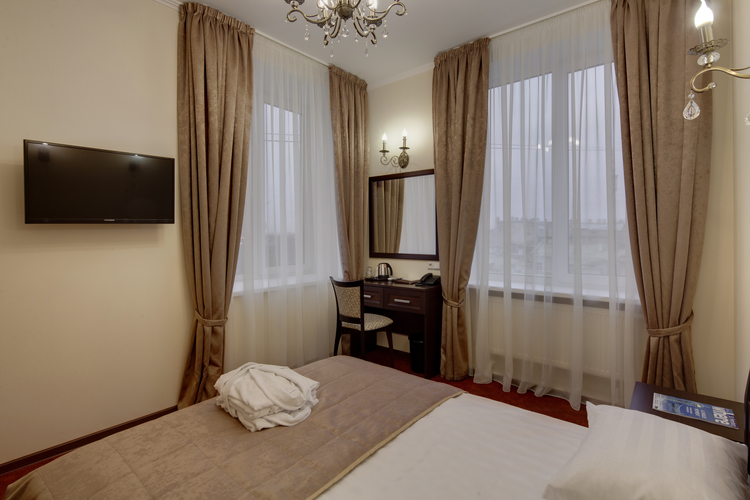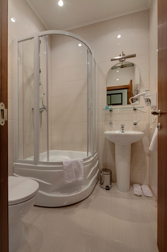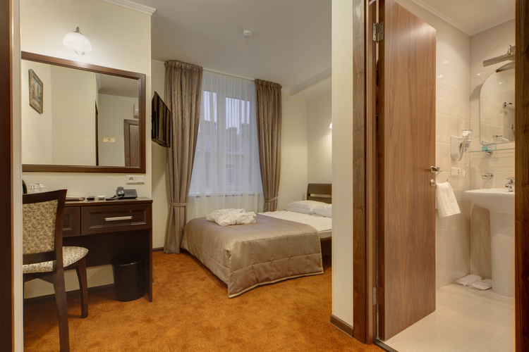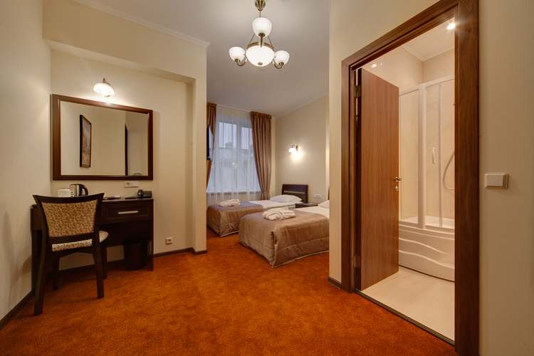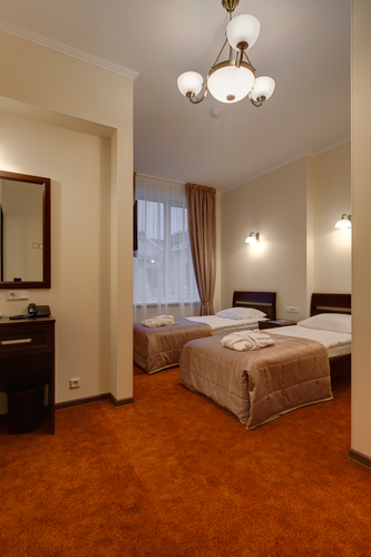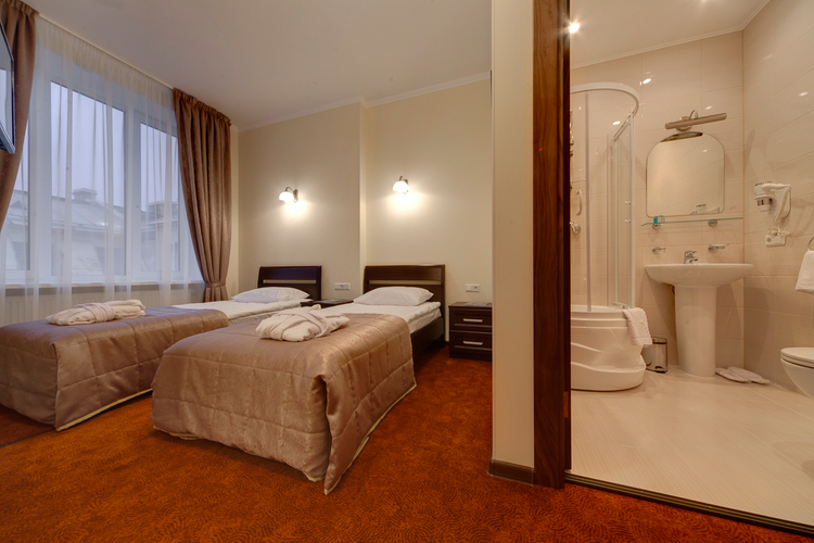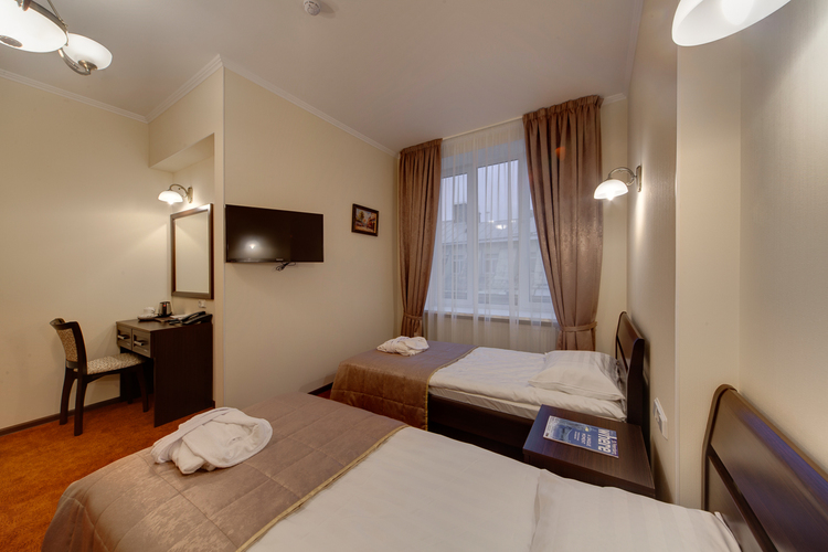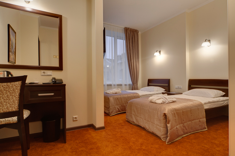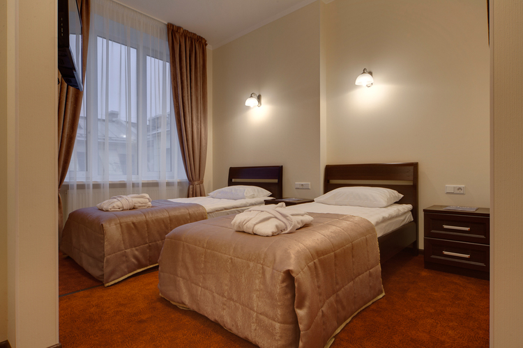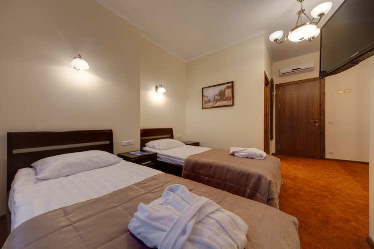 Светлая просторная комната, 17 кв.м. с 2 раздельными кроватями. Телевизор, кондиционер. В комнате располагаются все необходимые удобства, для комфортного проживания (душевая кабина). Телефон, выход в Интернет. Вид на город.