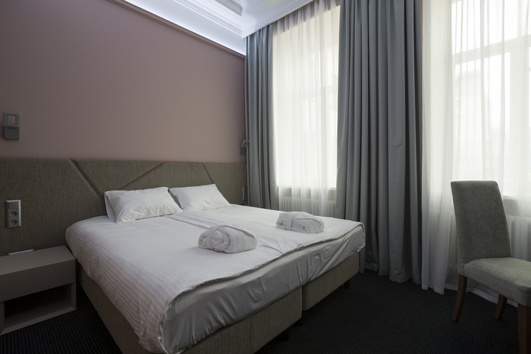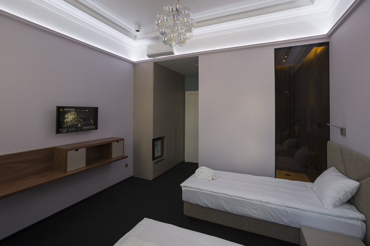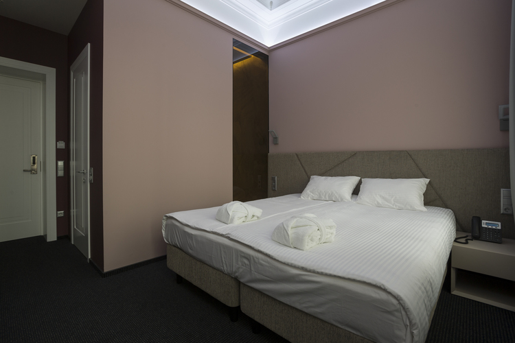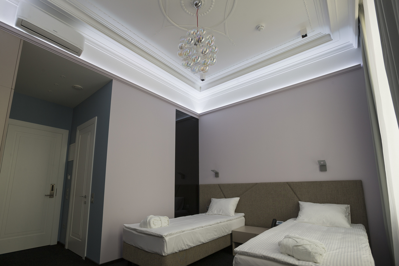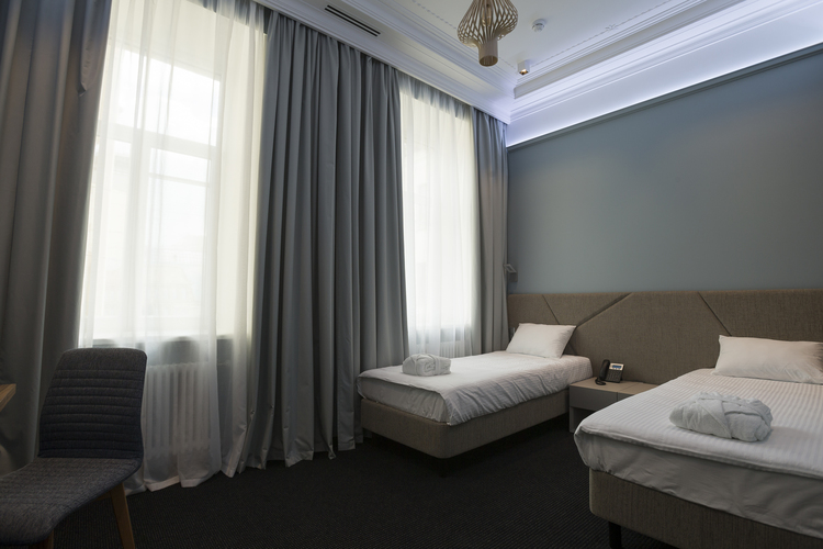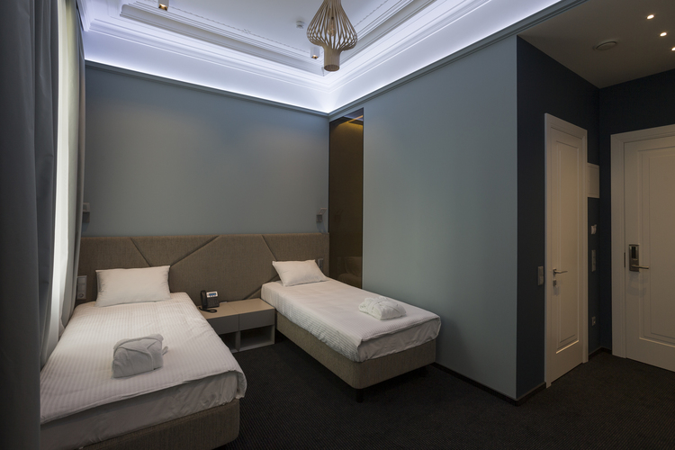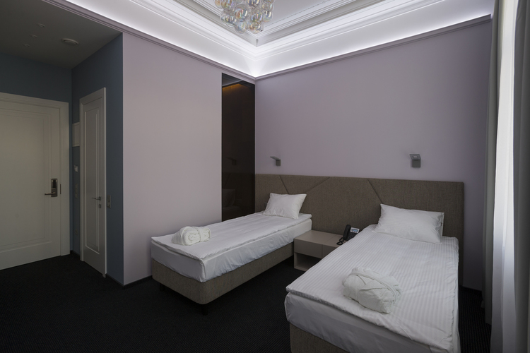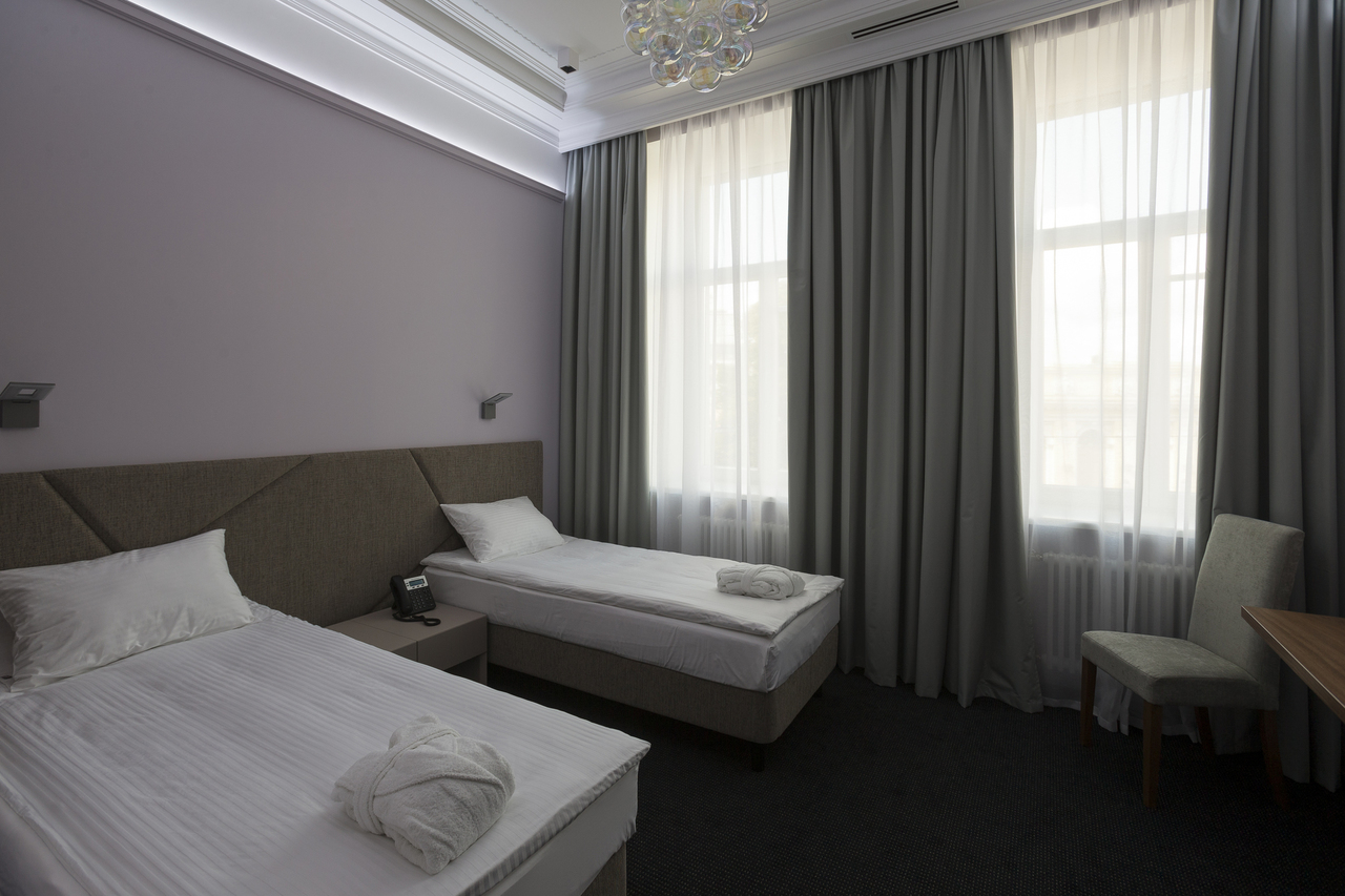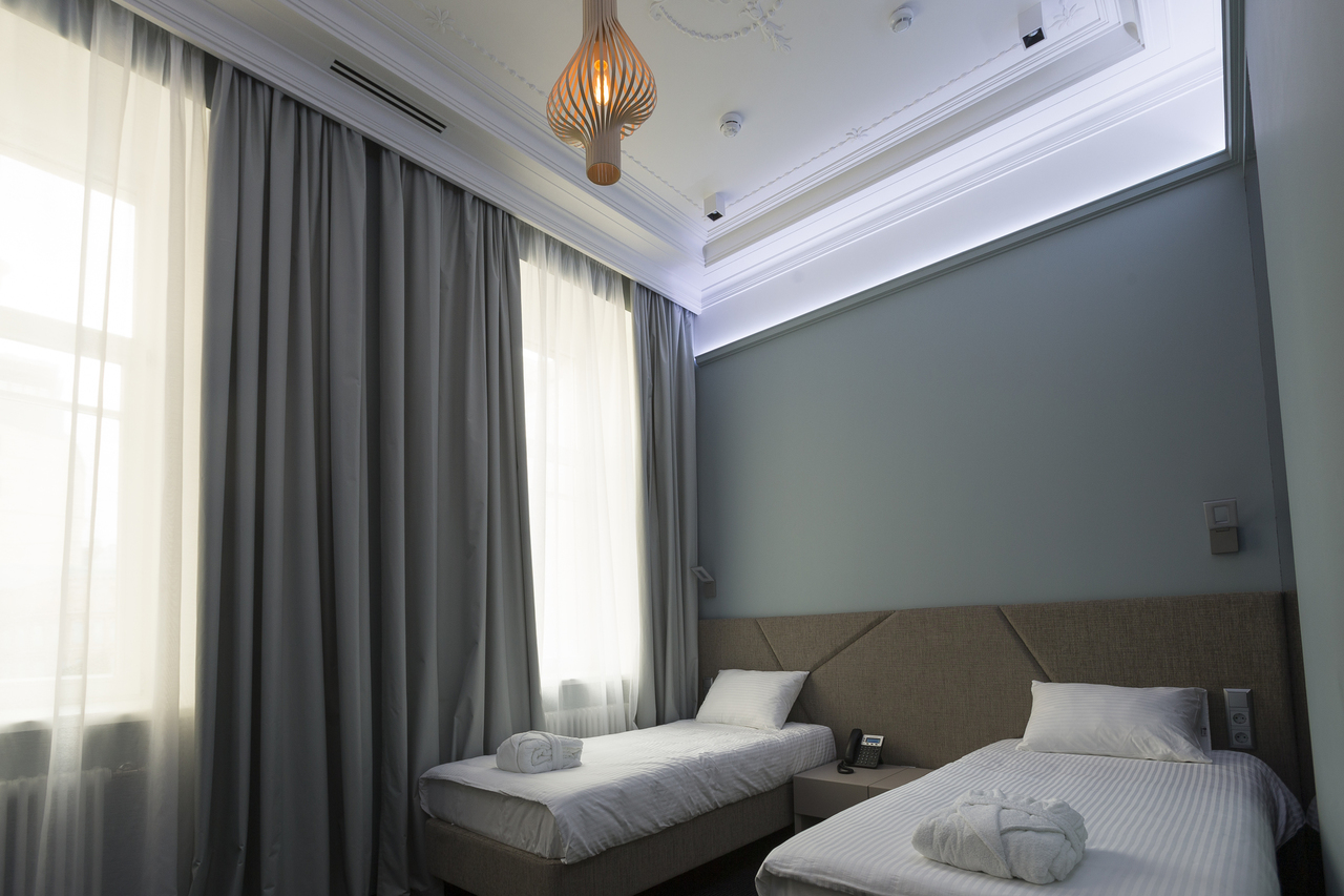 Уютный номер в теплых светлых тонах с видом на Манежную площадь/Итальянский дворик оборудован 2 односпальными и всеми необходимыми удобствами. Потолок номера оформлен неповторимой лепниной, на полу спальни практичное ковровое покрытие, а в отдельной ванной комнате теплый пол с подогревом.