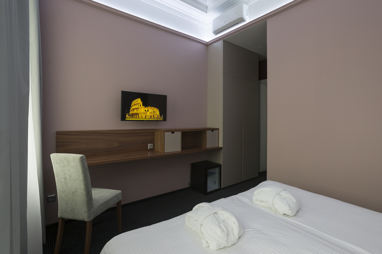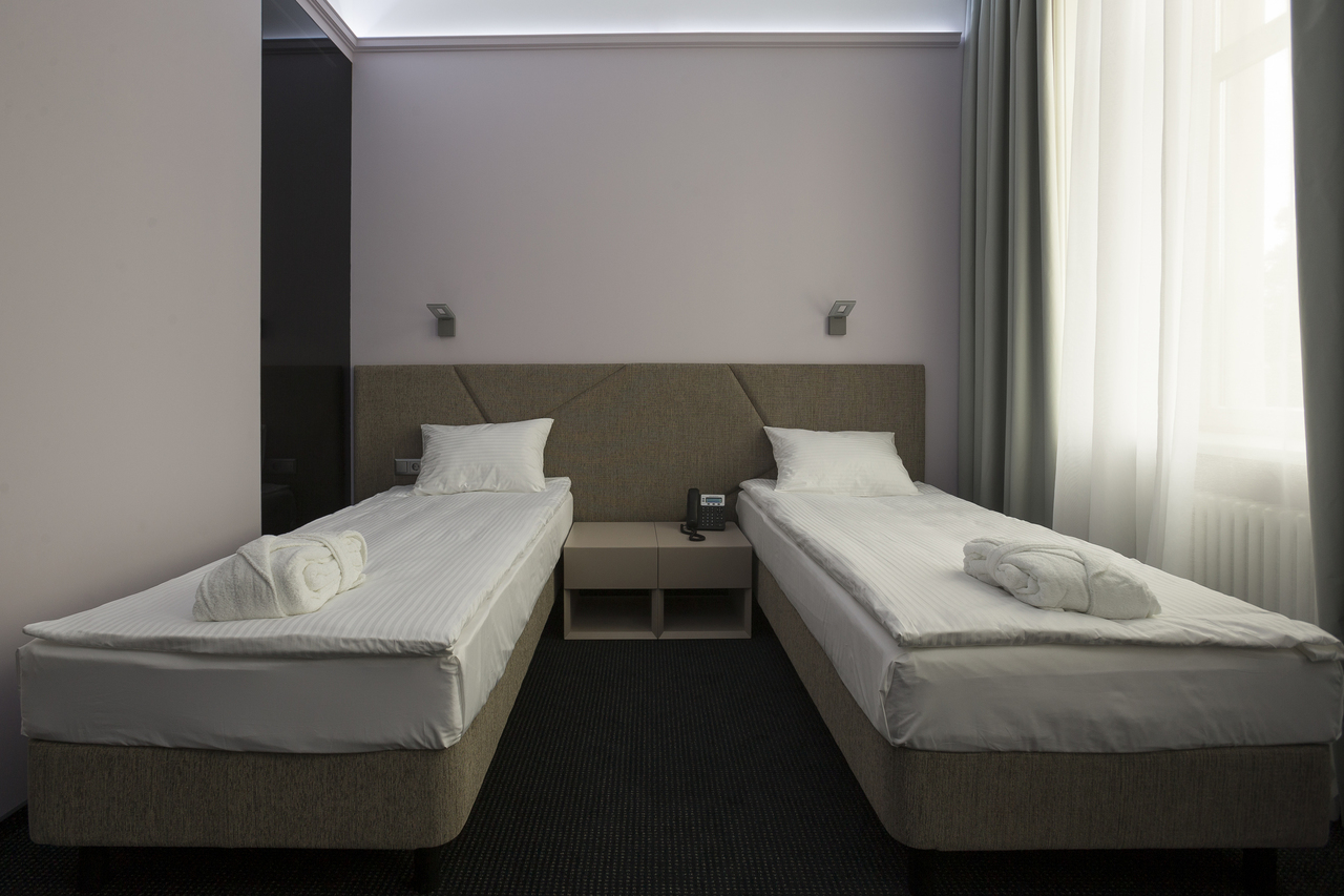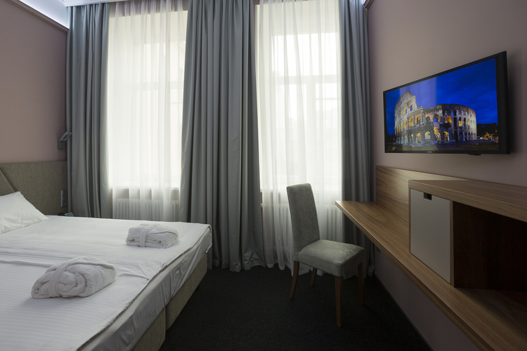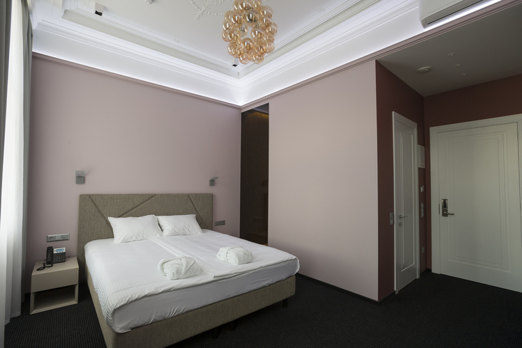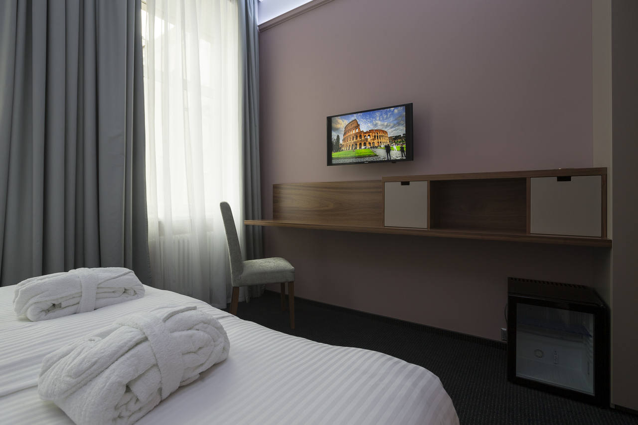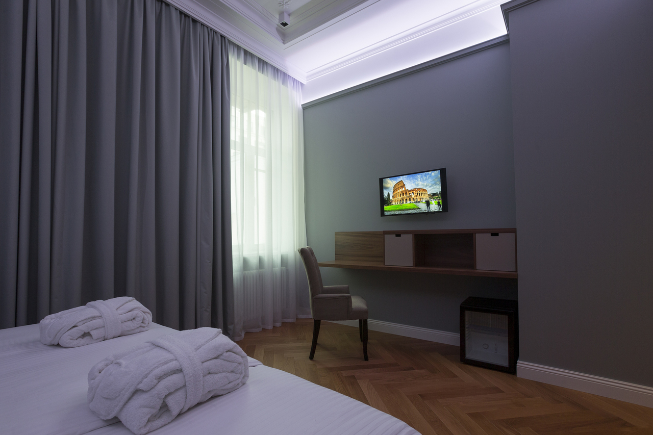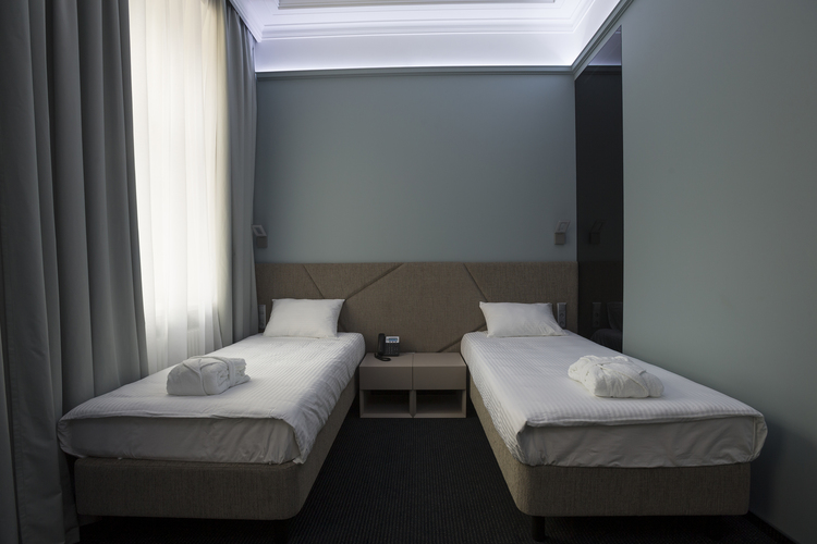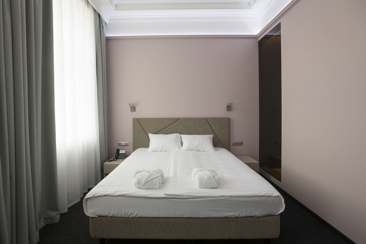 Уютный номер, оформленный в светлых тонах с видом на Итальянский дворик, оборудован 2 односпальными или 1 двуспальной кроватью, SmartTV, мини-баром. Отдельная ванная комната с душем.