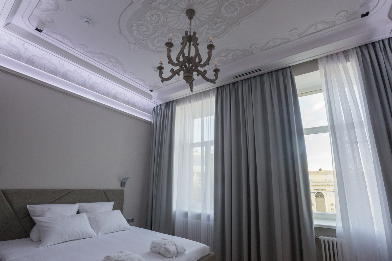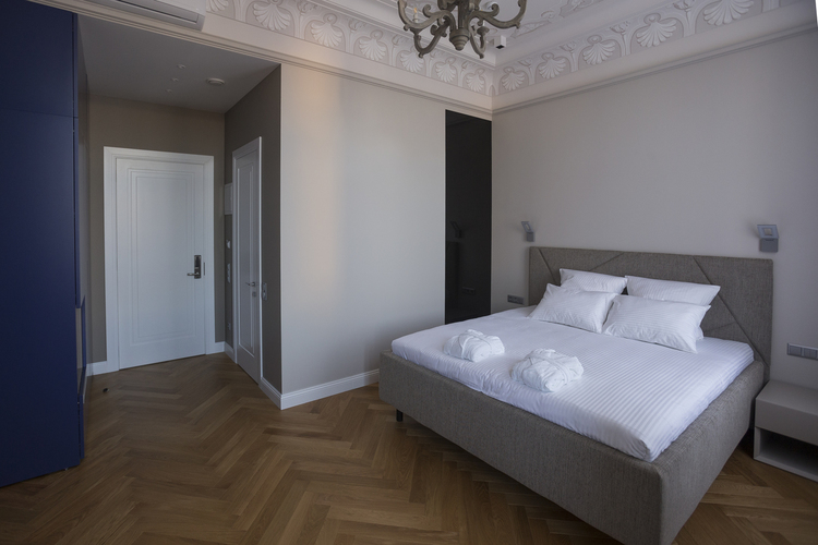 Уютный номер в светлых тонах с видом на Манежную площадь оборудован 1 двуспальной кроватью и всеми необходимыми удобствами. Потолок номера оформлен уникальной росписью, на полу спальни паркетная доска, а в отдельной ванной комнате теплый пол с подогревом.