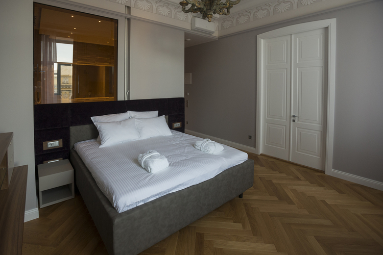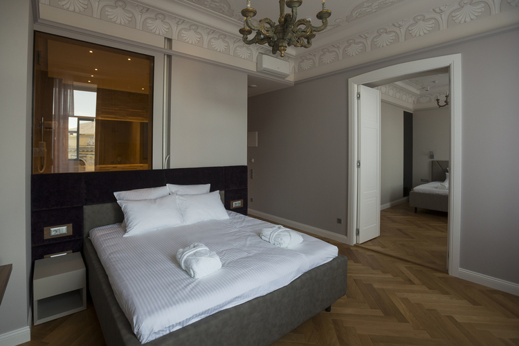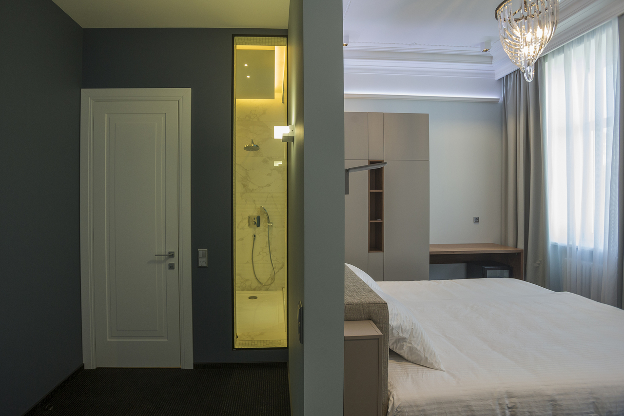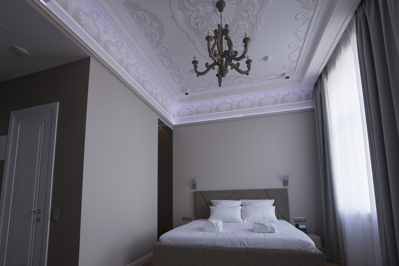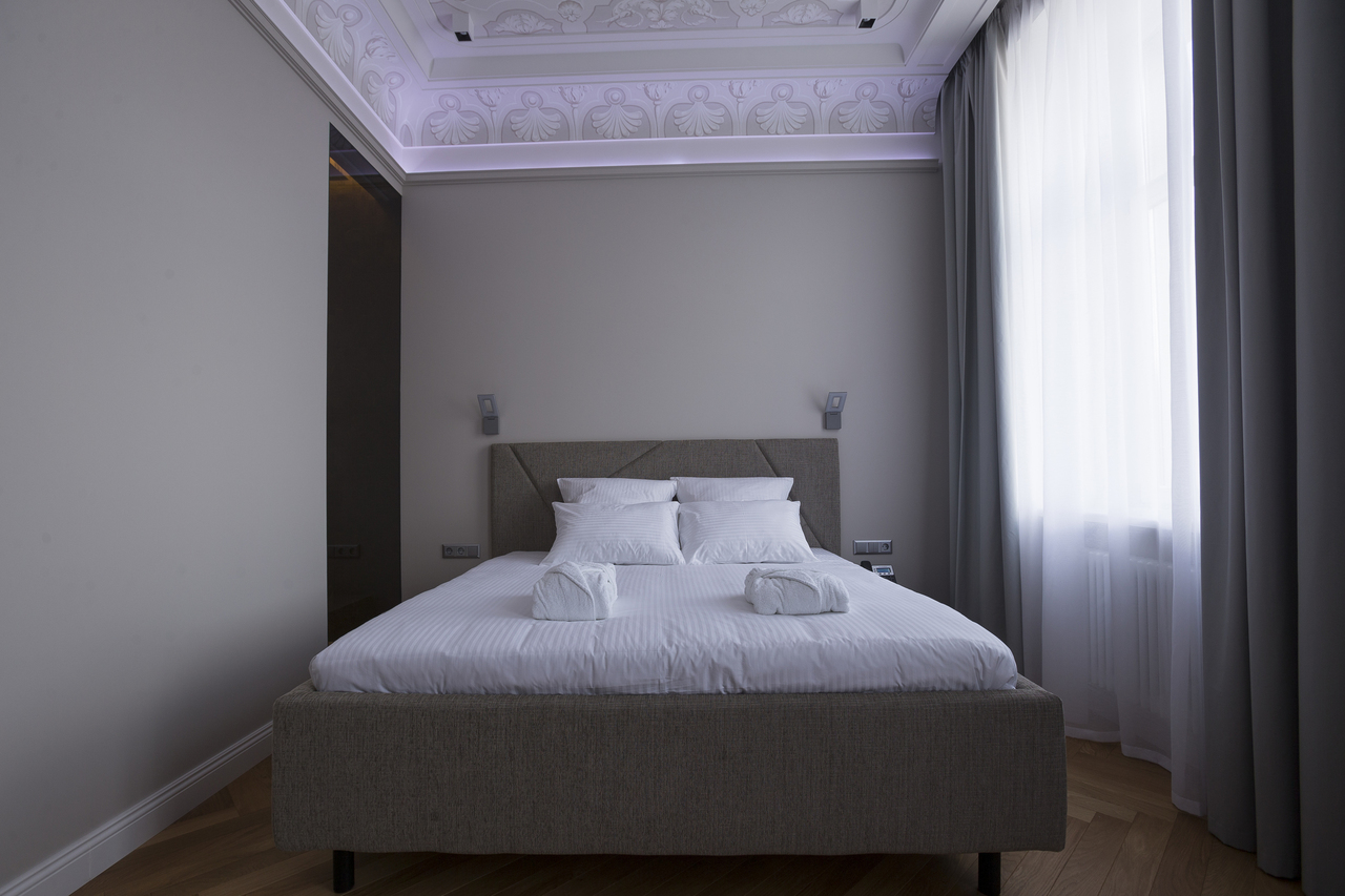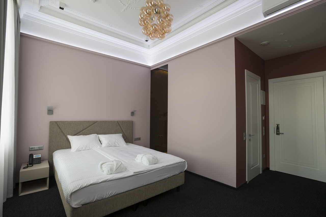 Уютный номер в теплых светлых тонах с изолированием спальни с видом на Манежную площадь оборудован 1 двуспальной кроватью и всеми необходимыми удобствами. Потолок номера оформлен неповторимой лепниной, на полу спальни практичное ковровое покрытие, а в отдельной ванной комнате теплый пол с подогревом.