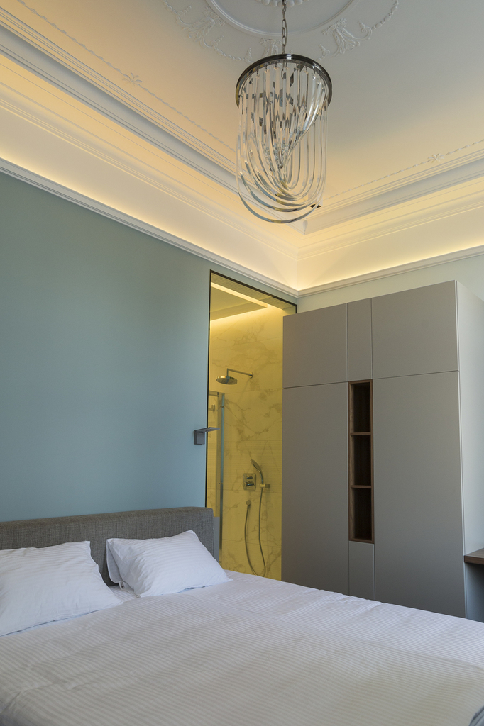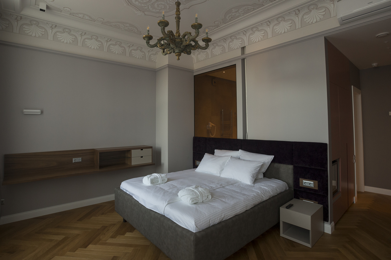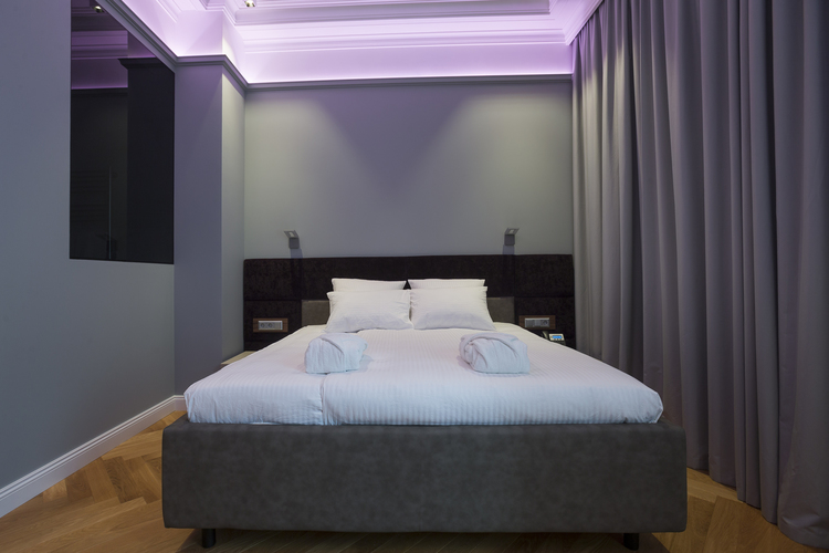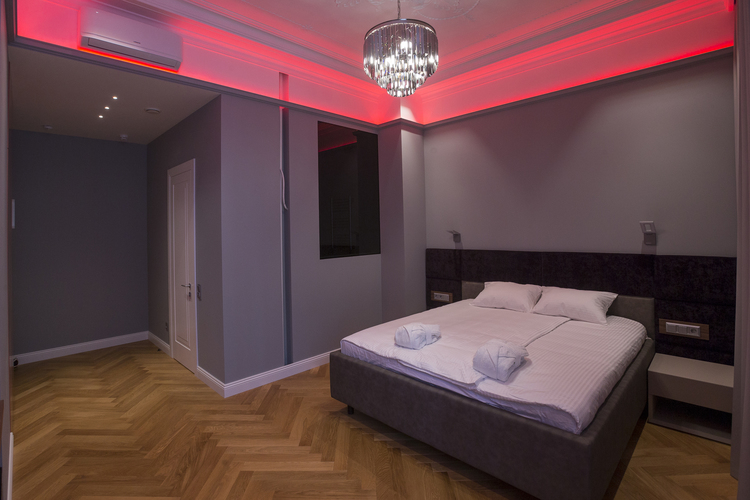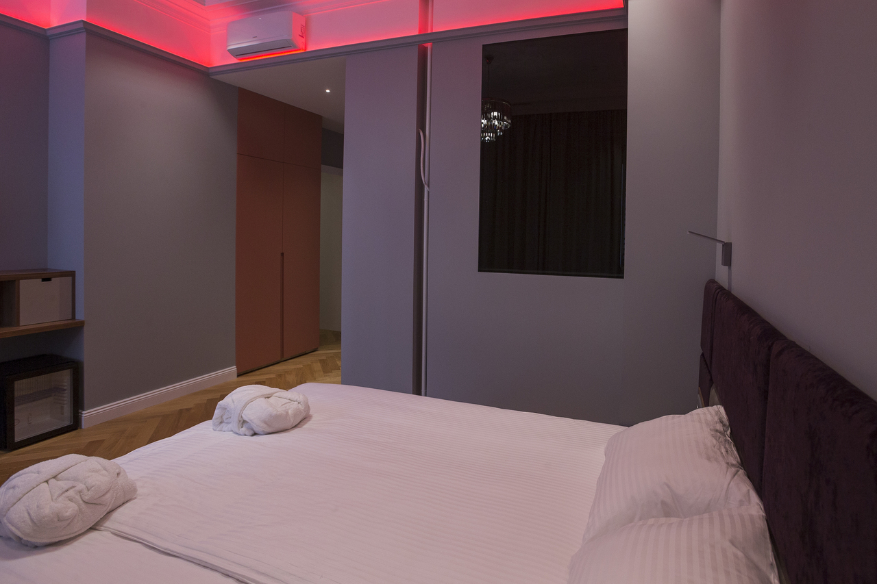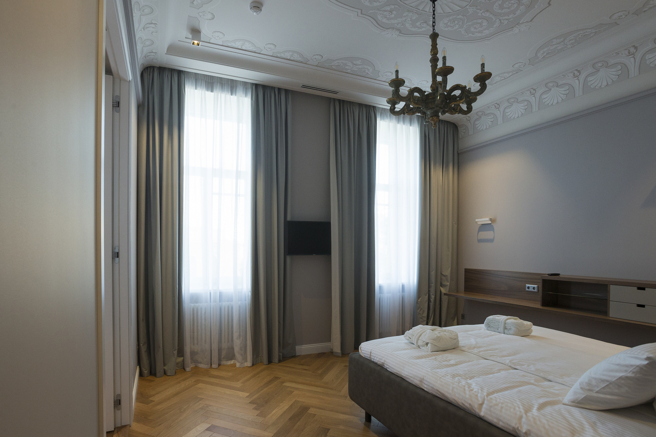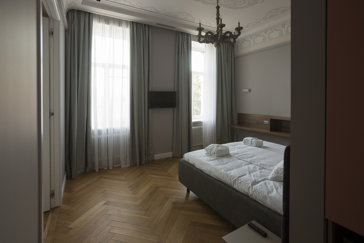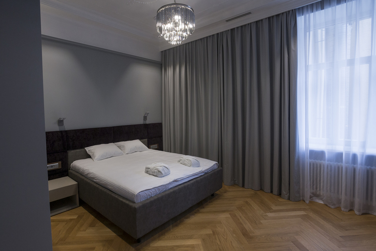 Уютный номер в теплых светлых тонах с изолированием спальни с видом на Манежную площадь оборудован 1 двуспальной кроватью и всеми необходимыми удобствами. Потолок номера оформлен неповторимой лепниной, на полу спальни практичное ковровое покрытие, а в отдельной ванной комнате теплый пол с подогревом.