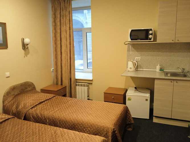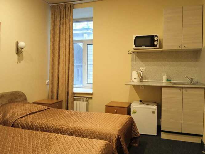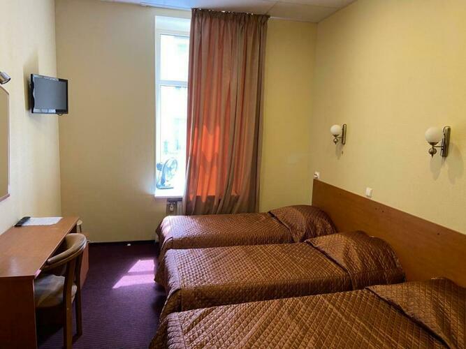 Номер 18 кв.м. В номере 2 раздельные кровати и доп.место, сейф, душ, туалет, TV, телефон, холодильник. В ванной комнате имеются разовые туалетные принадлежности. Окна выходят на Красноармейскую улицу. Третье место - раскладушка, кровать или кресло. Максимум для проживания - 3 Гостя. Курение в номере запрещено.