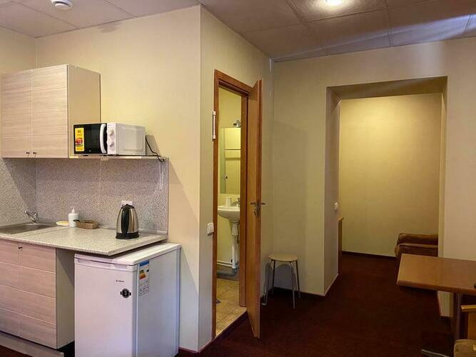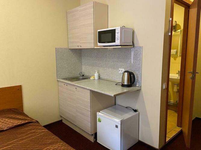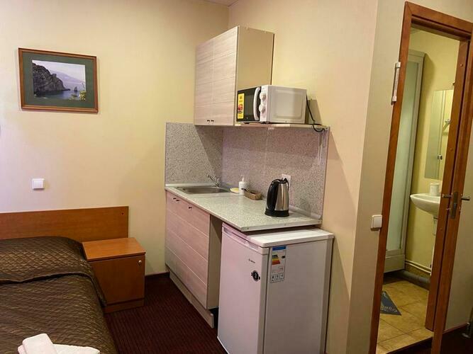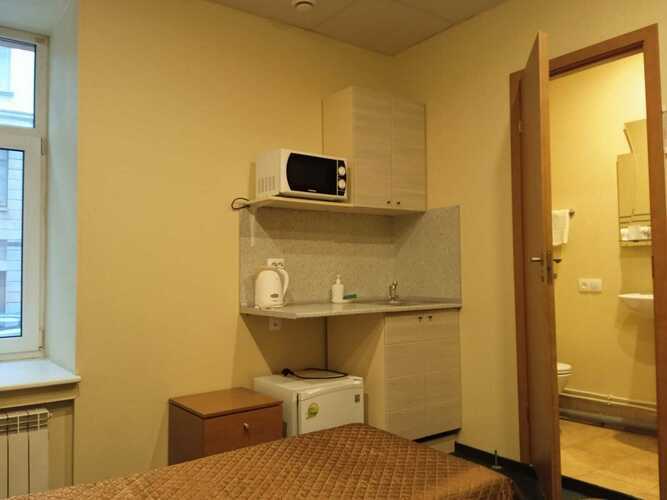 Номер 18 кв.м. В номере 1 двуспальная кровать, душ, туалет, TV, кухня, холодильник, электрический чайник, микроволновая печь. В ванной комнате имеются разовые туалетные принадлежности. Окна выходят во двор или на Красноармейскую улицу. Курение в номере запрещено.
