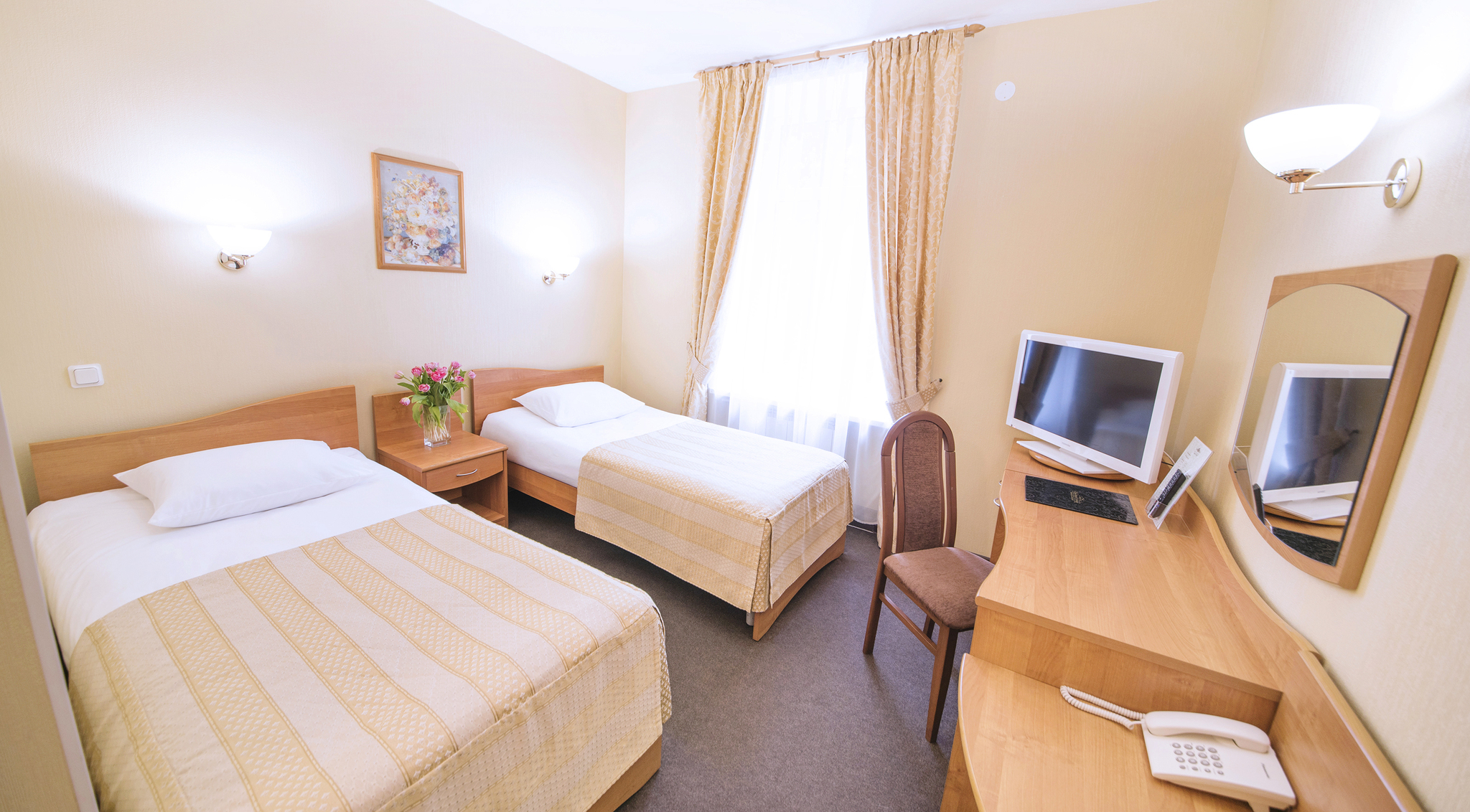 Номера двухместного размещения с двумя раздельными кроватями оформлены в современном стиле и светлых тонах. В номерах есть все необходимые удобства: удобные кровати, ванная комната, бесплатный Wi-Fi.