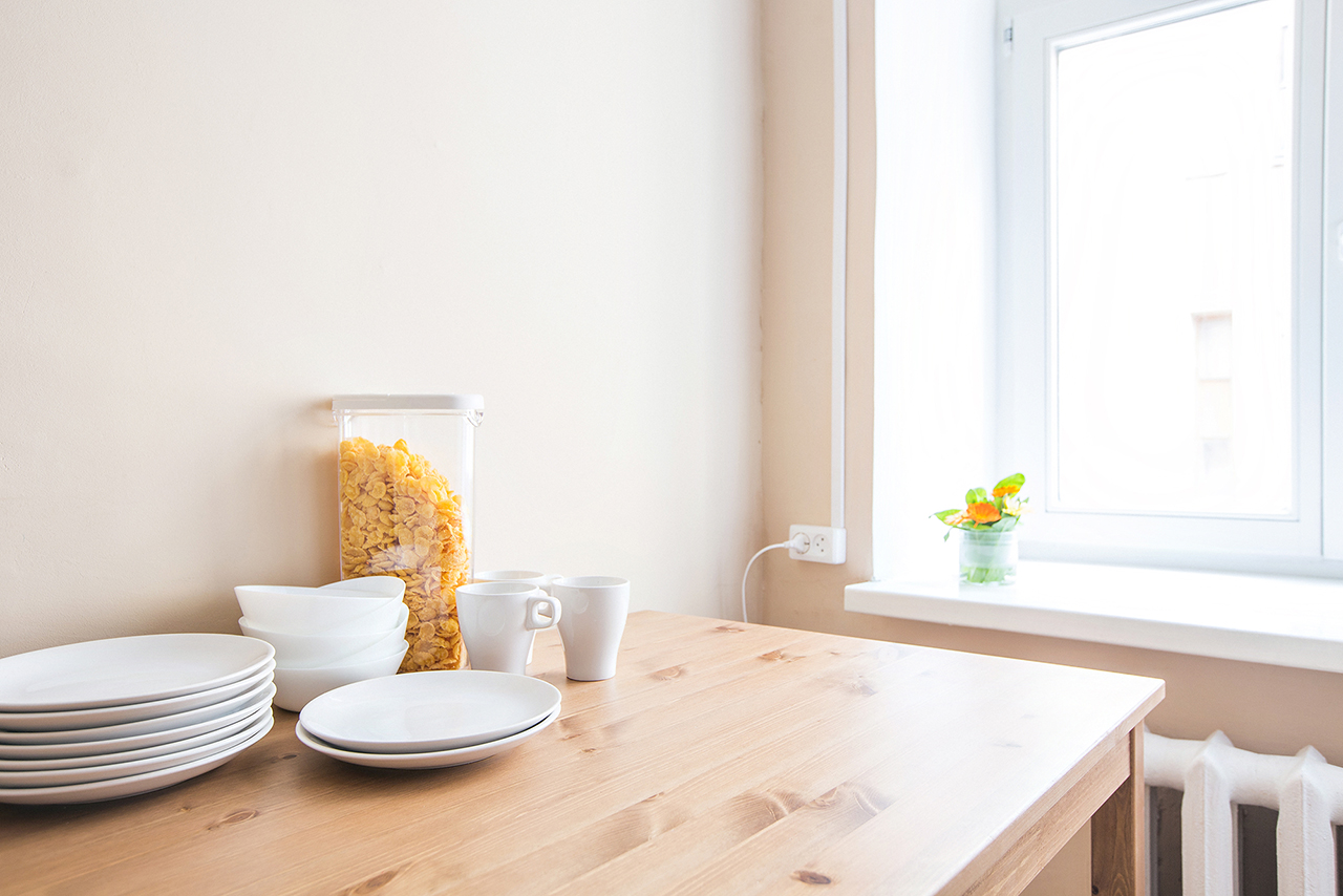 Оборудована микроволновой печью, газовой плитой, духовкой, холодильником, столом и стульями для приема пищи.