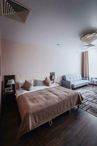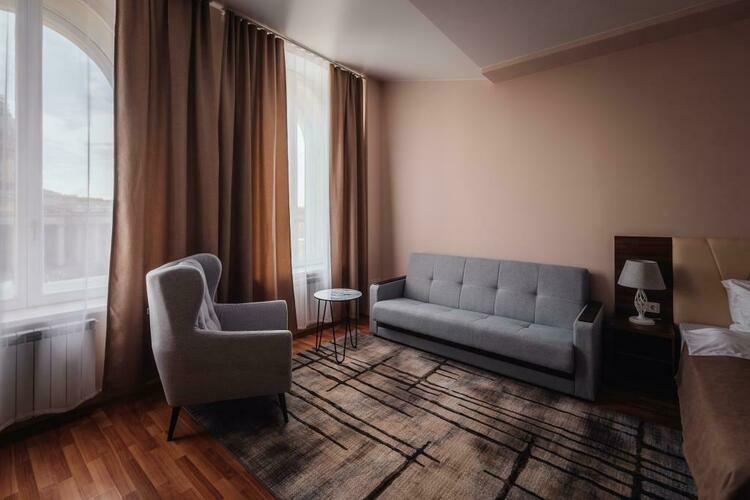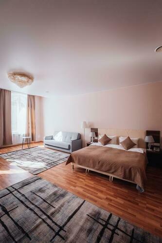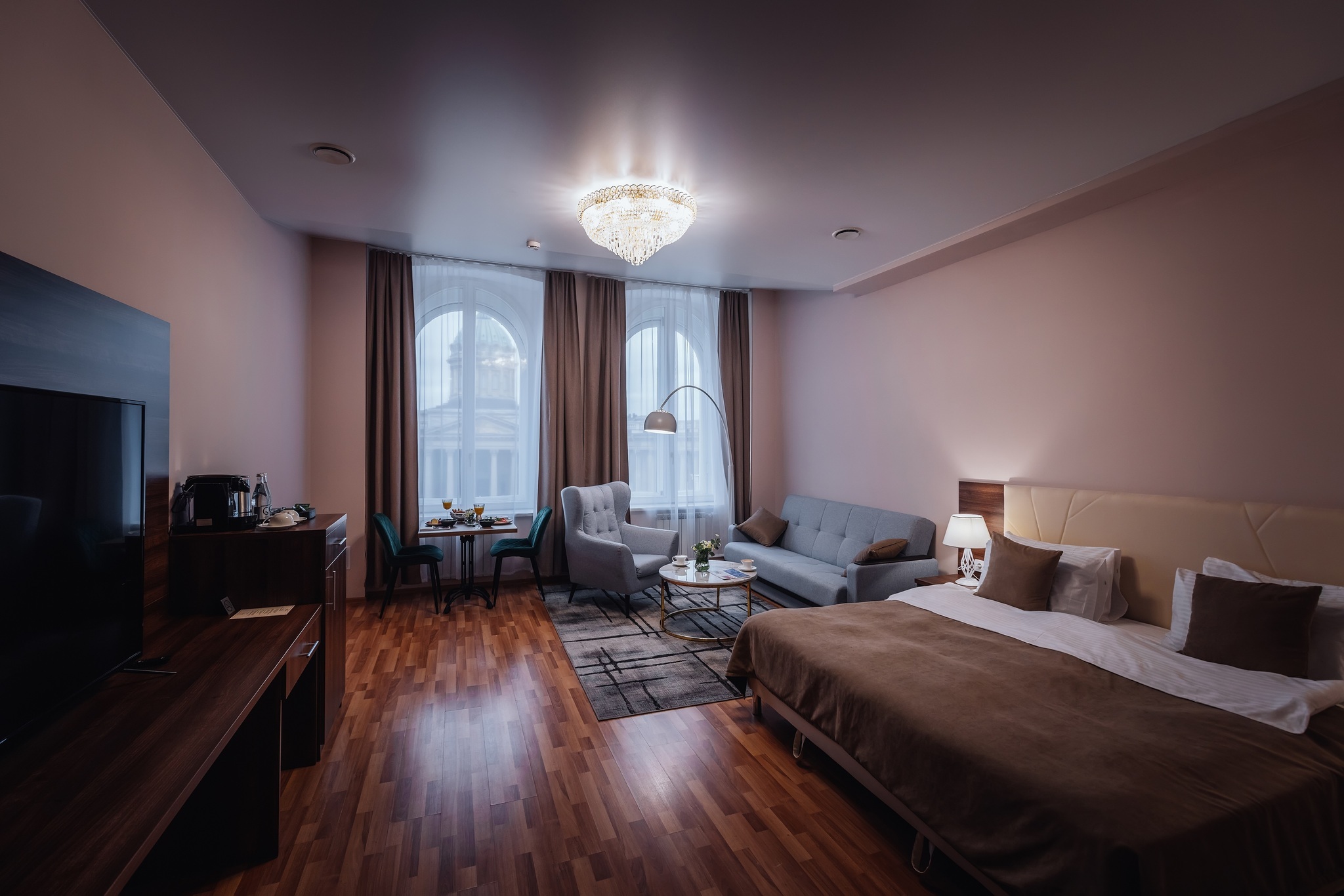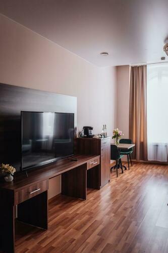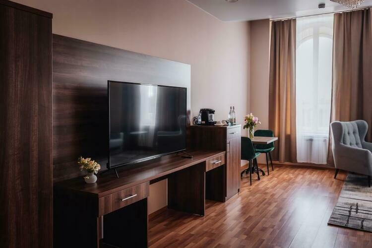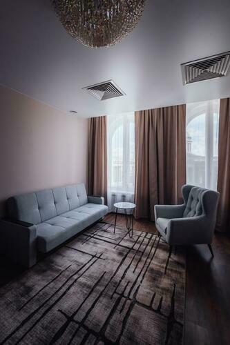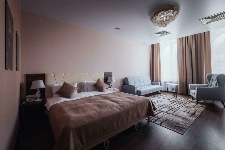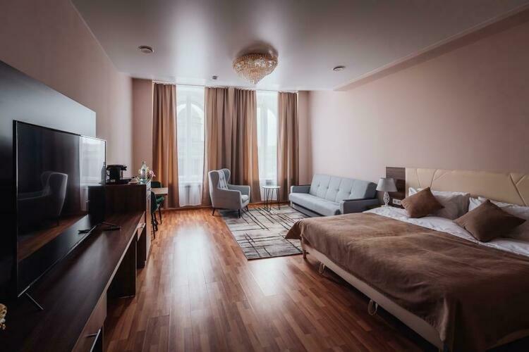 Великолепный номер "Люкс" с панорамными окнами и балконом. Вид на пешеходную зону улицы Малая Конюшенная позволит Вам насладиться красотами города не выходя из отеля! Площадь номера 55- 60 кв. м, возможно как двухместное размещение, так и семейное проживание (есть возможность поставить дополнительное спальное место и/или детскую кроватку). В номере есть все необходимое для комфортного проживания: двуспальная кровать размером King size, мягкое кресло и двухместный диванчик, телевизор, письменны