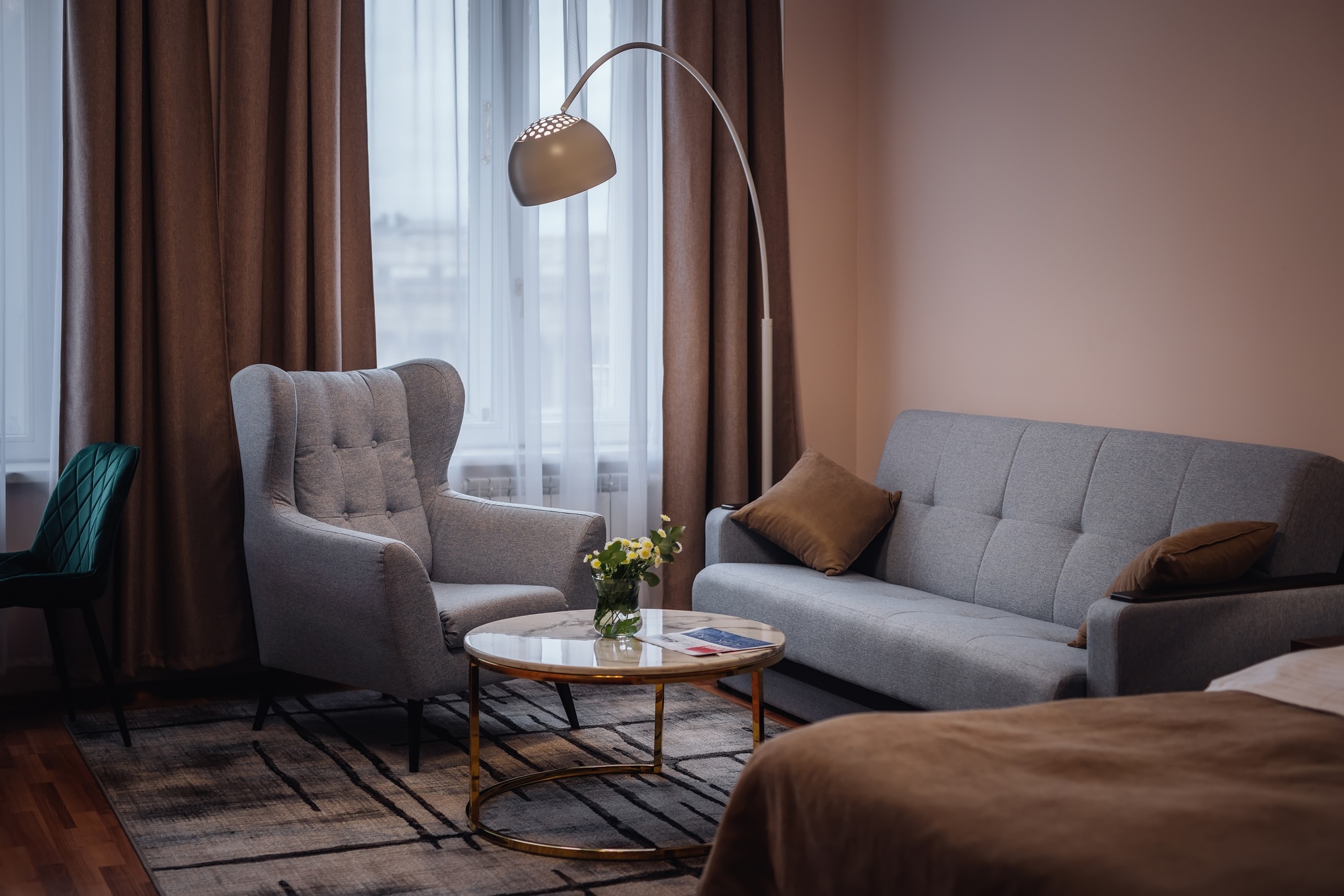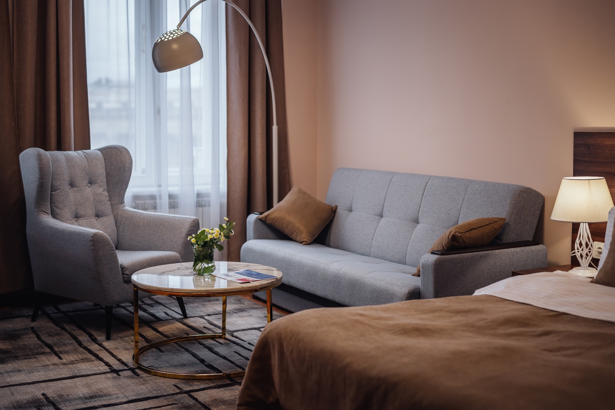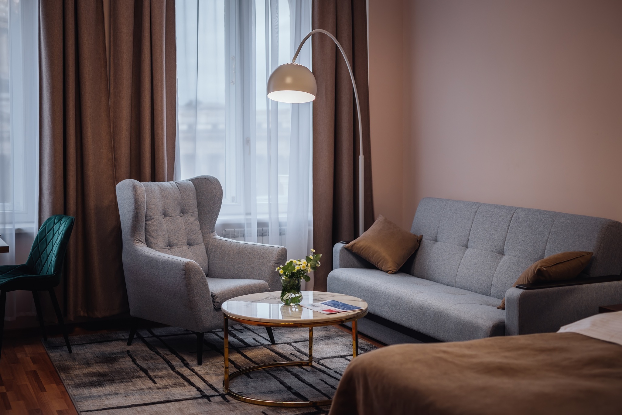 Великолепный номер "Люкс" с панорамными окнами и балконом. Вид на пешеходную зону улицы Малая Конюшенная позволит Вам насладиться красотами города не выходя из отеля! Площадь номера 55- 60 кв. м, возможно как двухместное размещение, так и семейное проживание (есть возможность поставить дополнительное спальное место и/или детскую кроватку). В номере есть все необходимое для комфортного проживания: двуспальная кровать размером King size, мягкое кресло и двухместный диванчик, телевизор, письменны