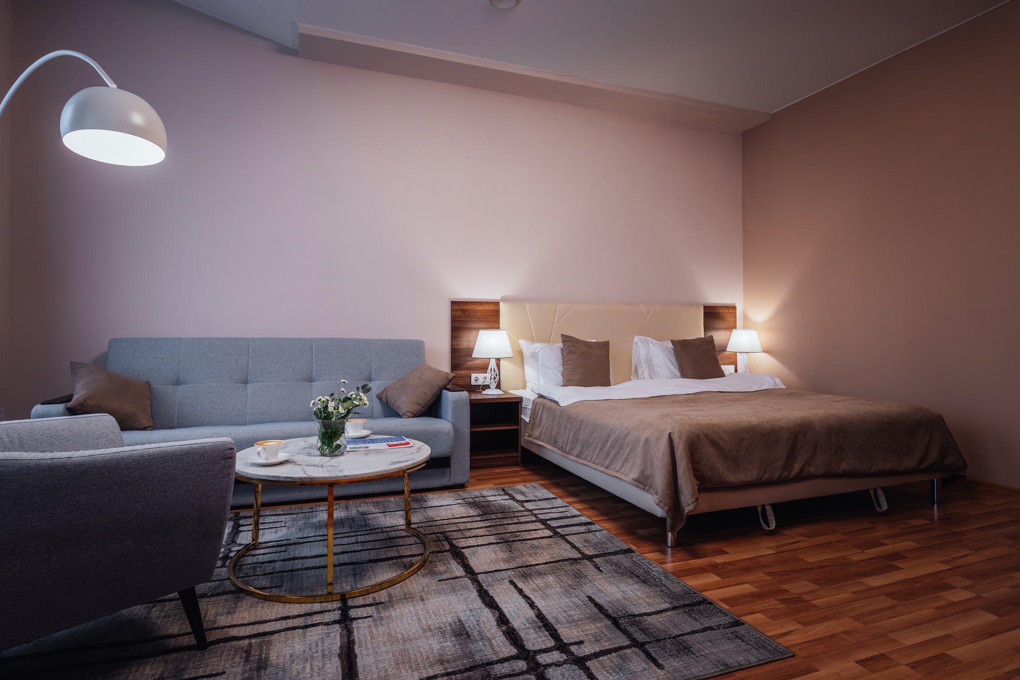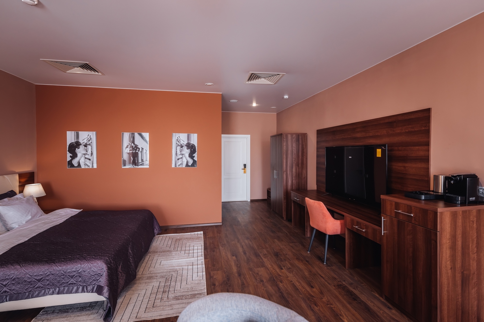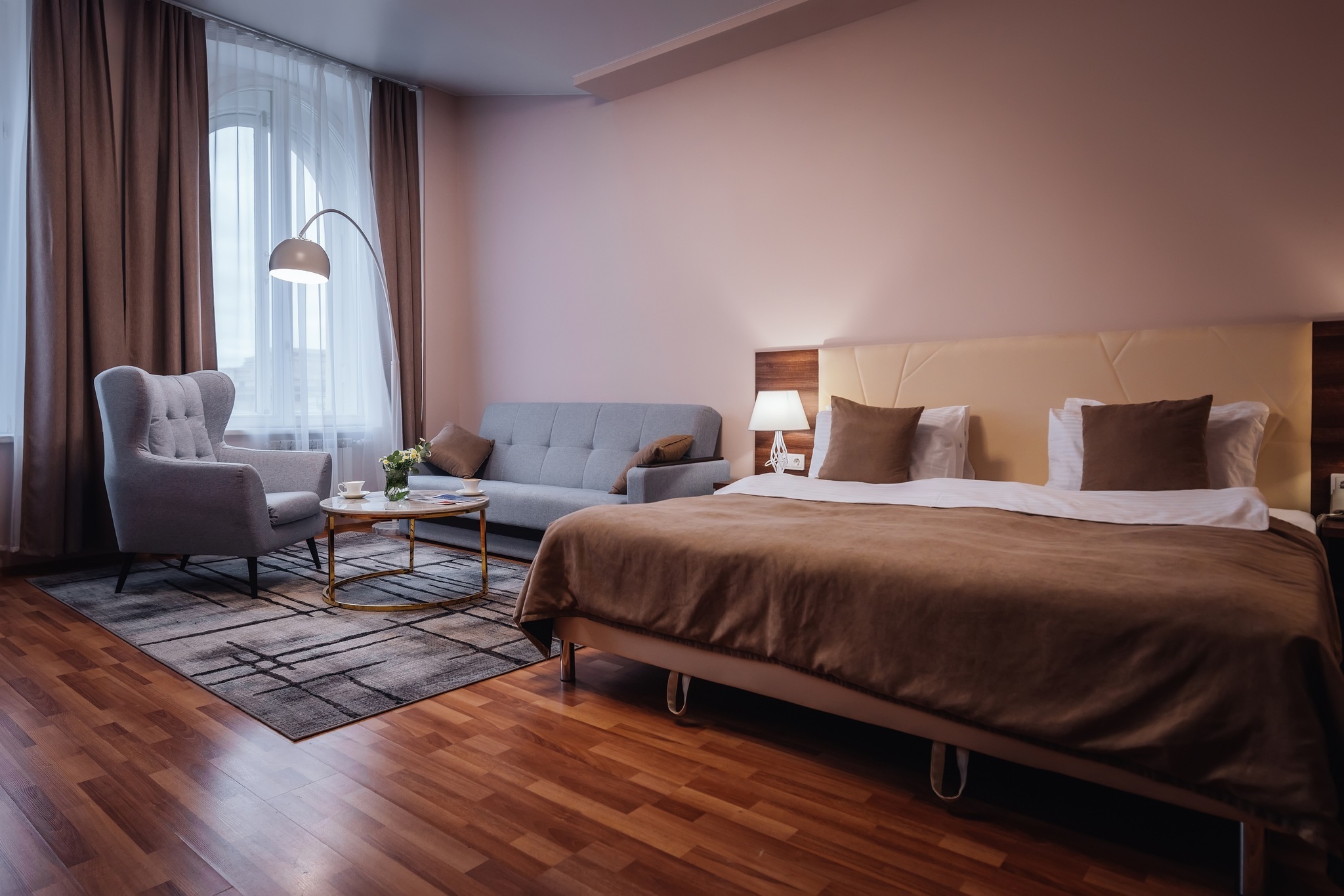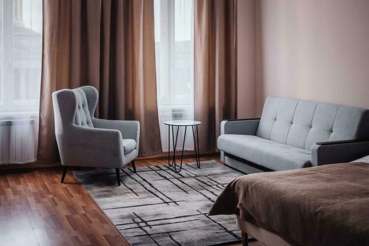 Комфортабельный двухкомнатный номер площадью 45 кв. м подойдет для размещения 4-6 гостей с детьми. Из панорамных окон номера открывается прекрасный вид на историческую пешеходную улицу города - ул. Малая Конюшенная! В номере: 2 изолированные спальни, 2 санузла, общий холл. Двуспальная кровать (King size) в каждой комнате, высокий ортопедический матрас, комфортабельная мебель, шкаф для хранения одежды, плазменный телевизор, многоканальный телефон, wi-fi, кондиционер, сейф, мини-бар, кофе-машина
