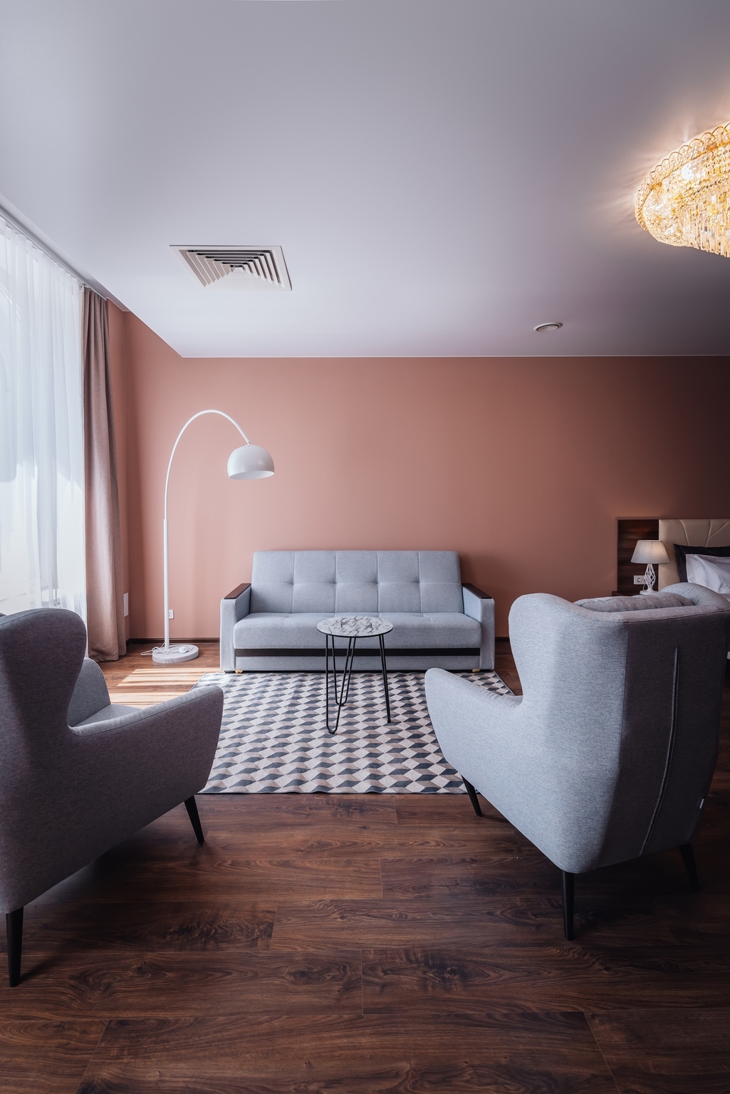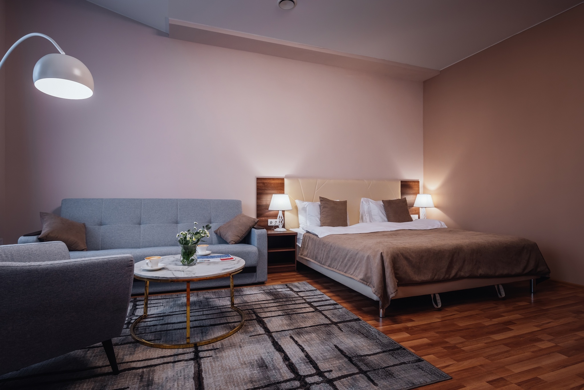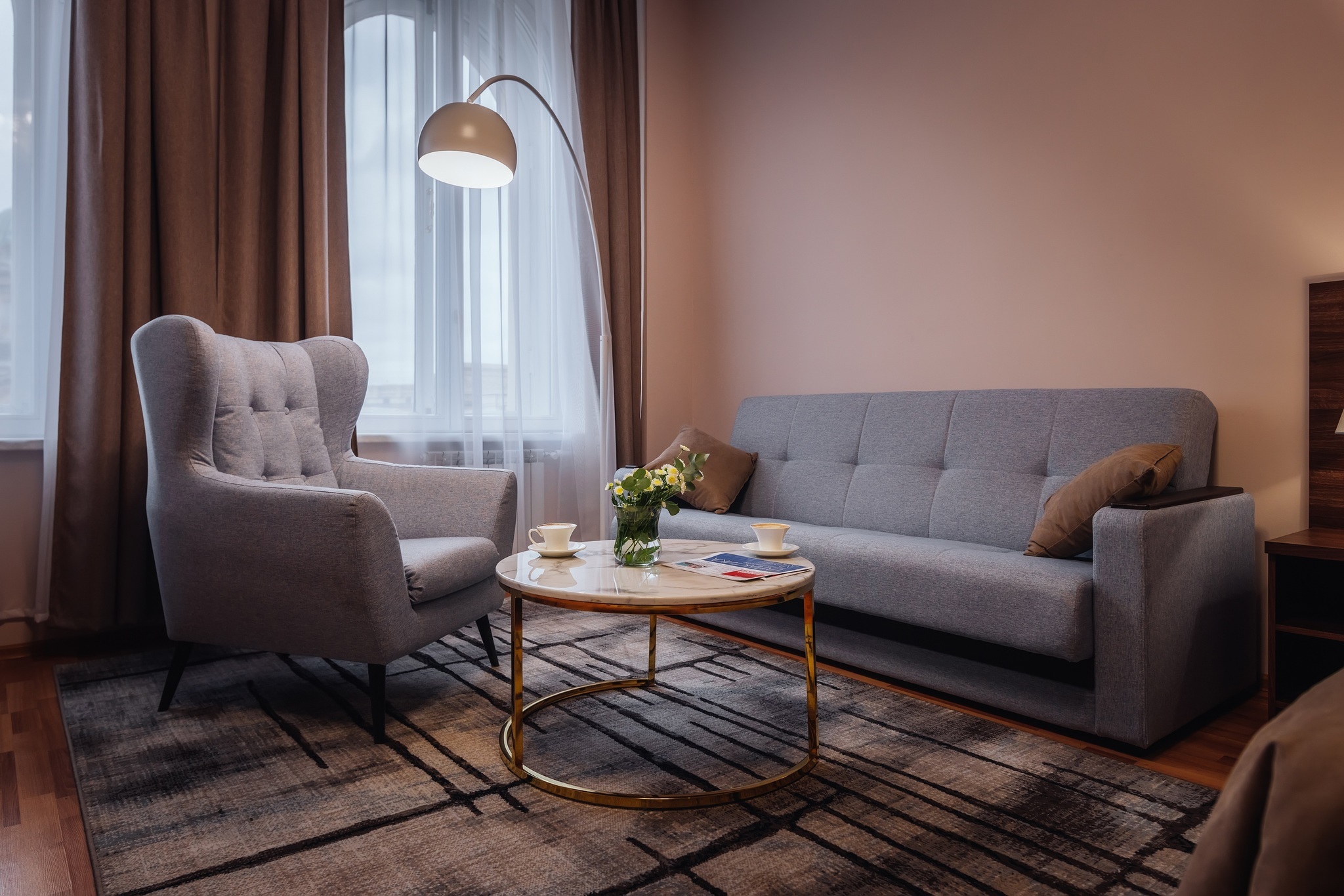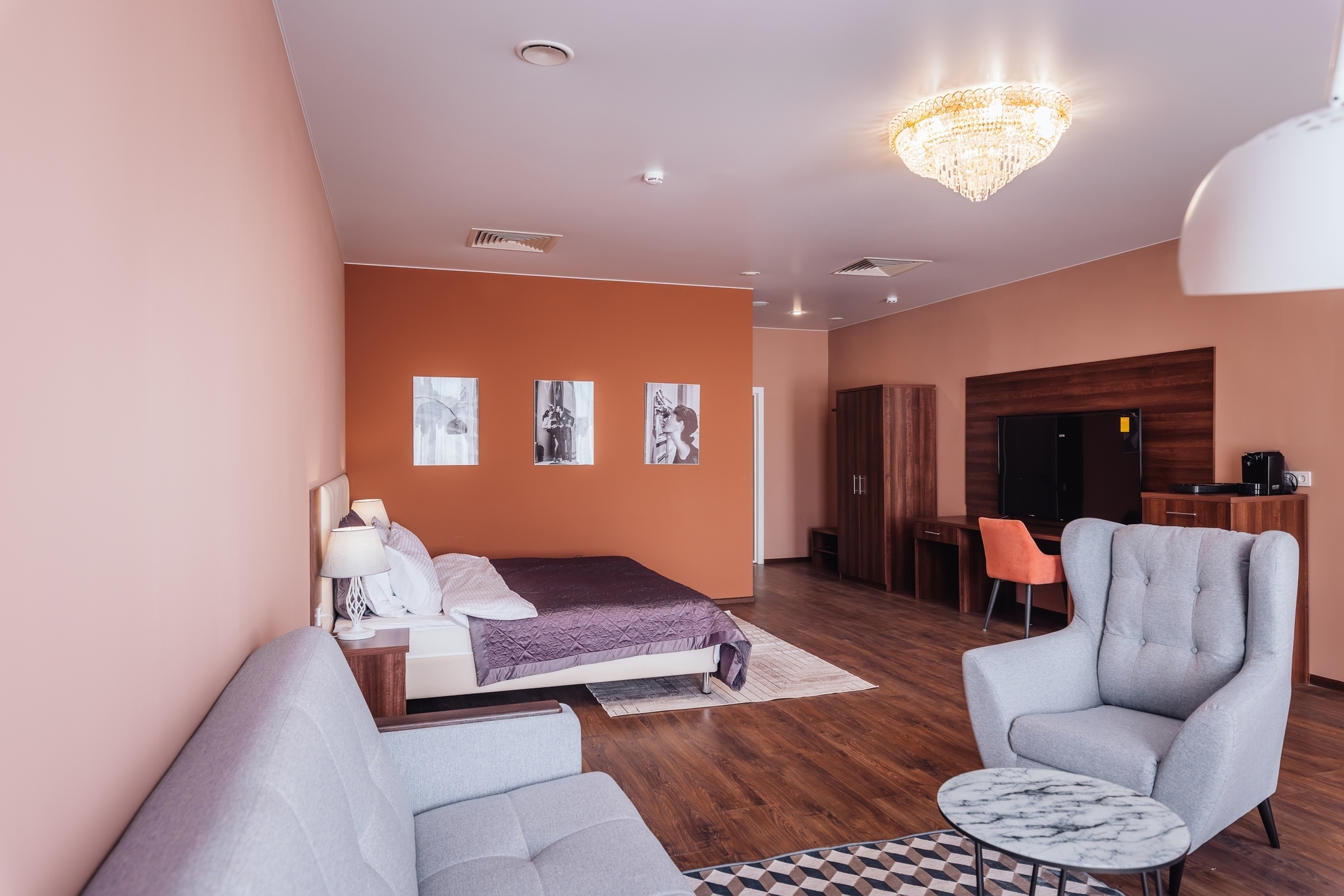 Комфортабельный двухкомнатный номер площадью 45 кв. м подойдет для размещения 4-6 гостей с детьми. Из панорамных окон номера открывается прекрасный вид на историческую пешеходную улицу города - ул. Малая Конюшенная! В номере: 2 изолированные спальни, 2 санузла, общий холл. Двуспальная кровать (King size) в каждой комнате, высокий ортопедический матрас, комфортабельная мебель, шкаф для хранения одежды, плазменный телевизор, многоканальный телефон, wi-fi, кондиционер, сейф, мини-бар, кофе-машина