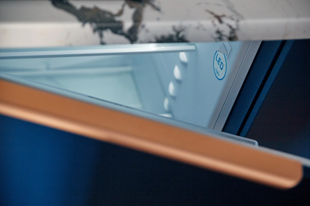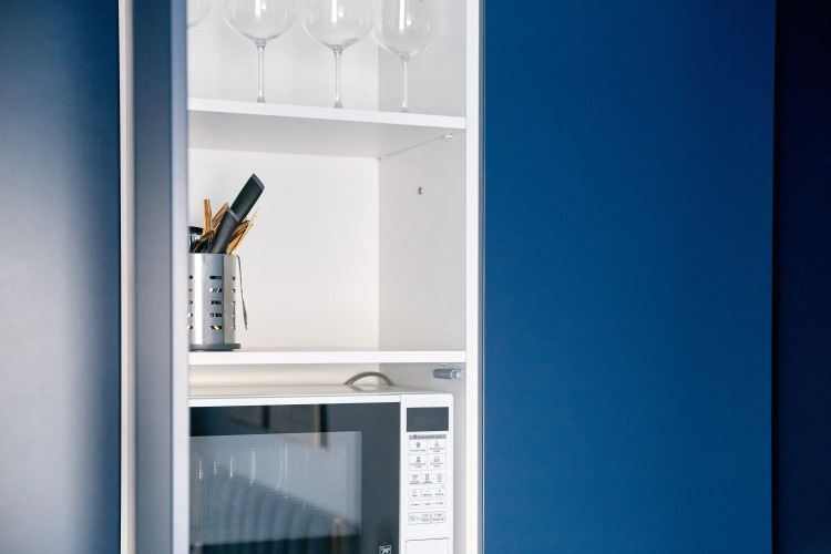 На кухне есть барный стол с двумя мягкими стульями, стиральная машина, микроволновая печь, чайник, варочная панель и вытяжка, холодильник, вентилятор, пылесос, утюг с гладильной доской и сушилка для одежды.