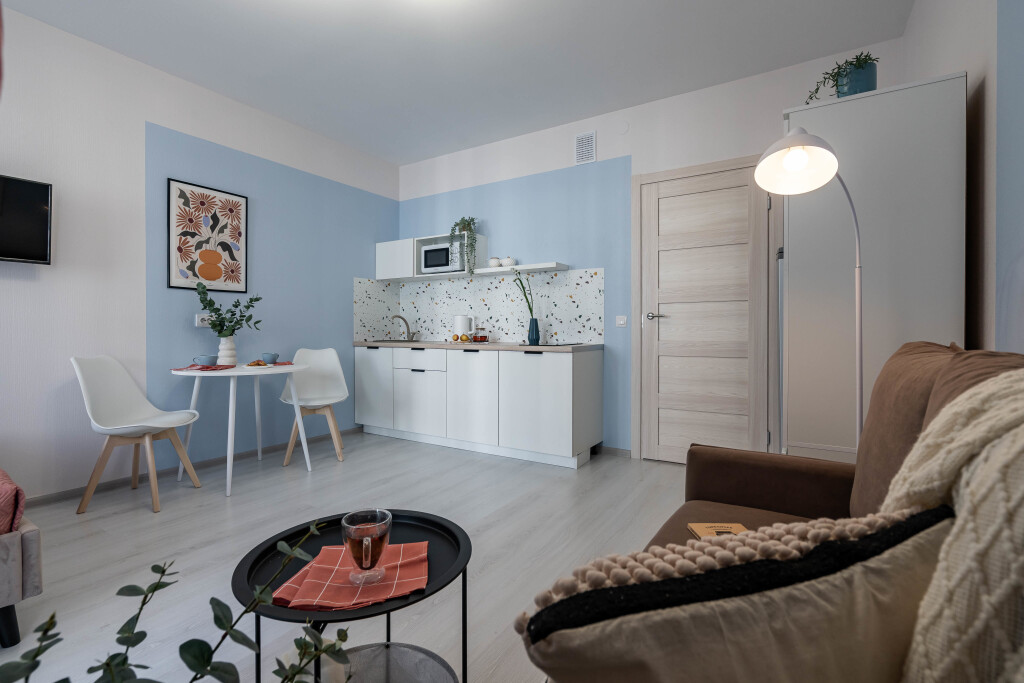 В апартаментах имеется двуспальная кровать и раскладной диван, телевизор со SMART-ТВ, Wi-Fi, лоджия. В квартире могут разместиться 3 взрослых гостя или двое взрослых и двое детей.