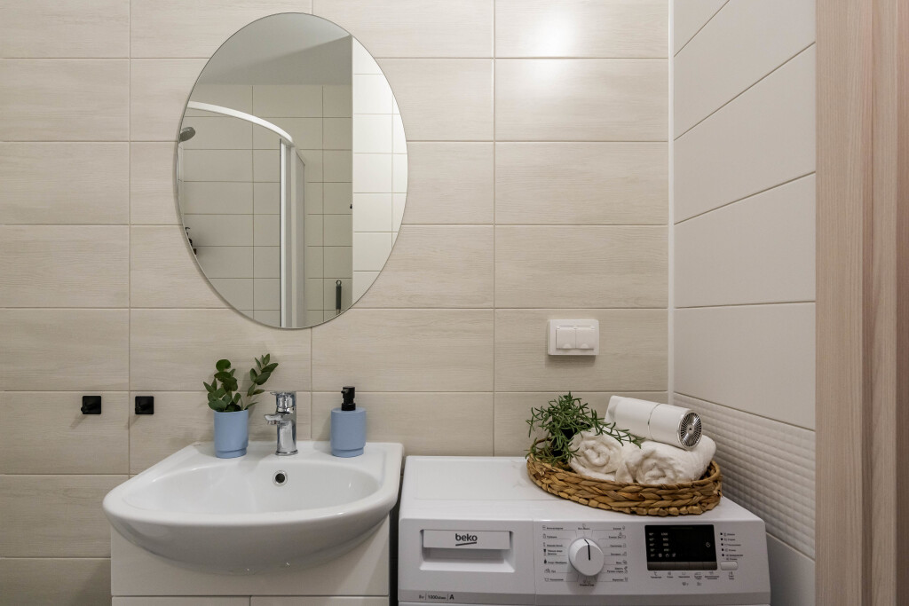 В санузле имеется тёплый пол, стиральная машина, фен, утюг, гладильная доска, комплект постельного белья и полотенца.