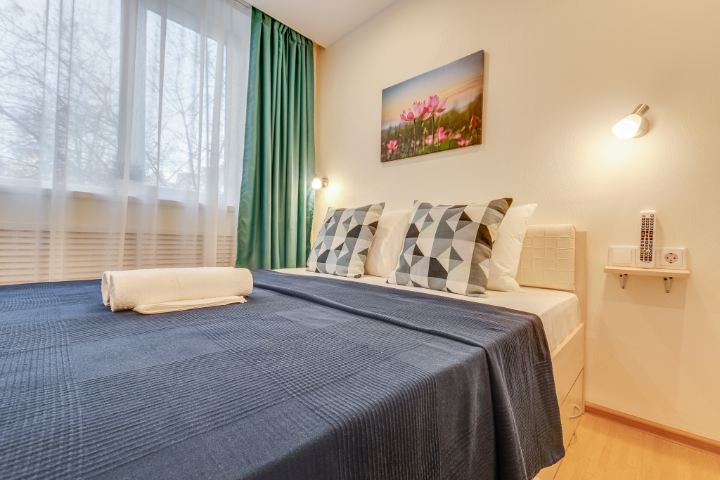 Апартаменты с двуспальной кроватью с ортопедическим матрасом, собственной кухней, душем, туалетом (гигиенические принадлежности и полотенца предоставляются).