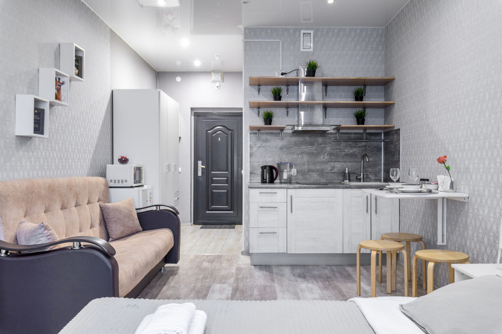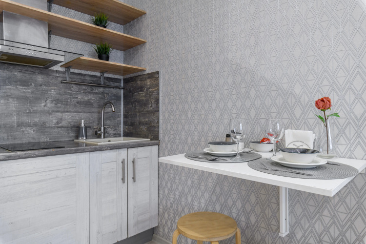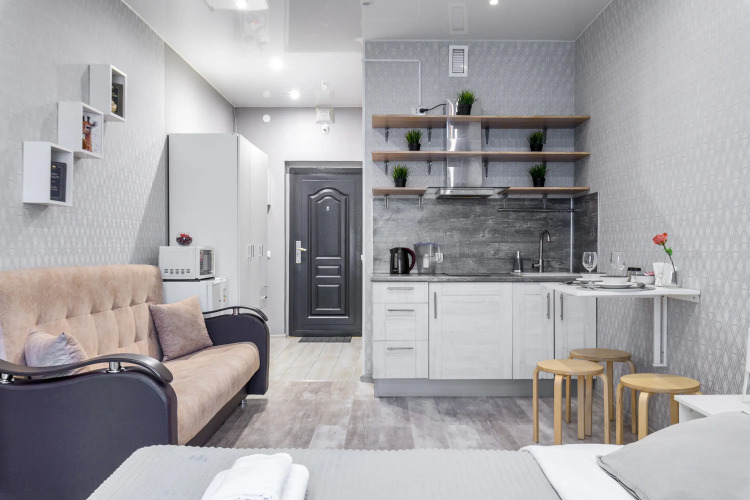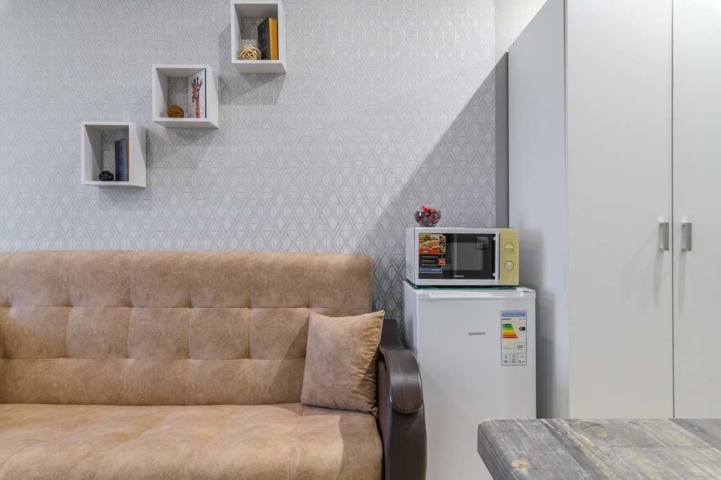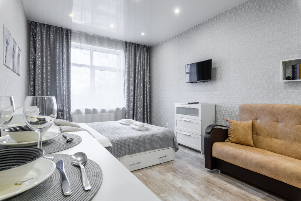 Апартаменты подходят для размещения 4 гостей: установлена двуспальная кровать и двуспальный раскладной диван.