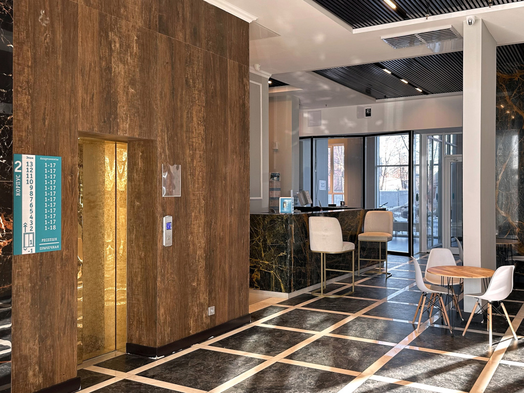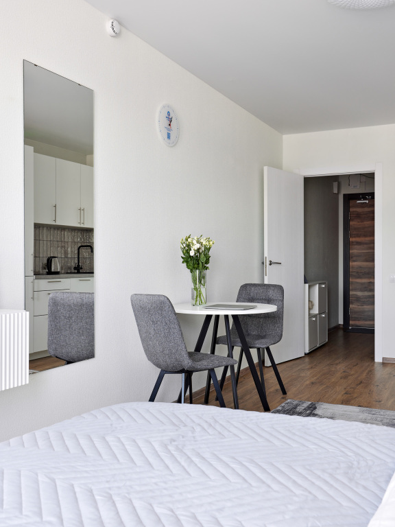 В апартаментах могут размещаться 1-2 гостя, имеется всё для проживания. Есть кровать с ортопедическим матрасом, шкаф и вешалка для вещей, обеденный стол, навесная тумба под ТВ и тумба-обувница. Гостям выдаётся постельное бельё и полотенца. В апартаментах есть шторы блэк-аут. Имеется бытовая техника: варочная панель, микроволновка и набор посуды и фильтр для воды, холодильник с морозилкой, посудомойка, телевизор со Smart TV, стиральная машина, фен, утюг. Работает бесплатный Wi-Fi.