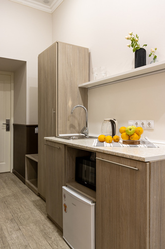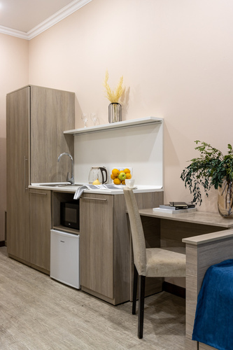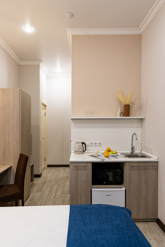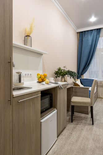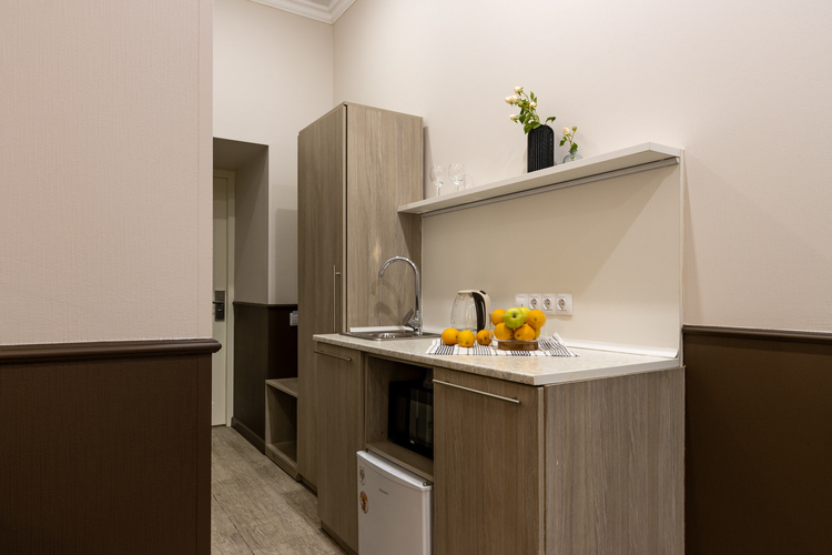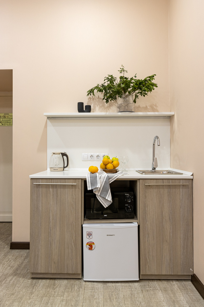 В номере есть оборудованная кухня с холодильником, мойкой, микроволновой печью и посудой.